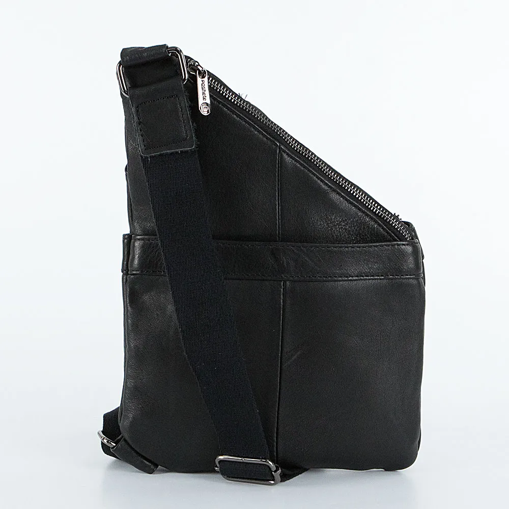Сумка-кобура от торговой марки Poshete из натуральной кожи черного цвета. Модель с регулируемой плечевой лямкой. Отделение на молнии. Внутри: фирменная подкладка, карман на молнии. На лицевой стороне – накладной карман с клапаном на магнитной кнопке, два кармана на молнии. На задней стороне – накладной карман на магнитной кнопке.