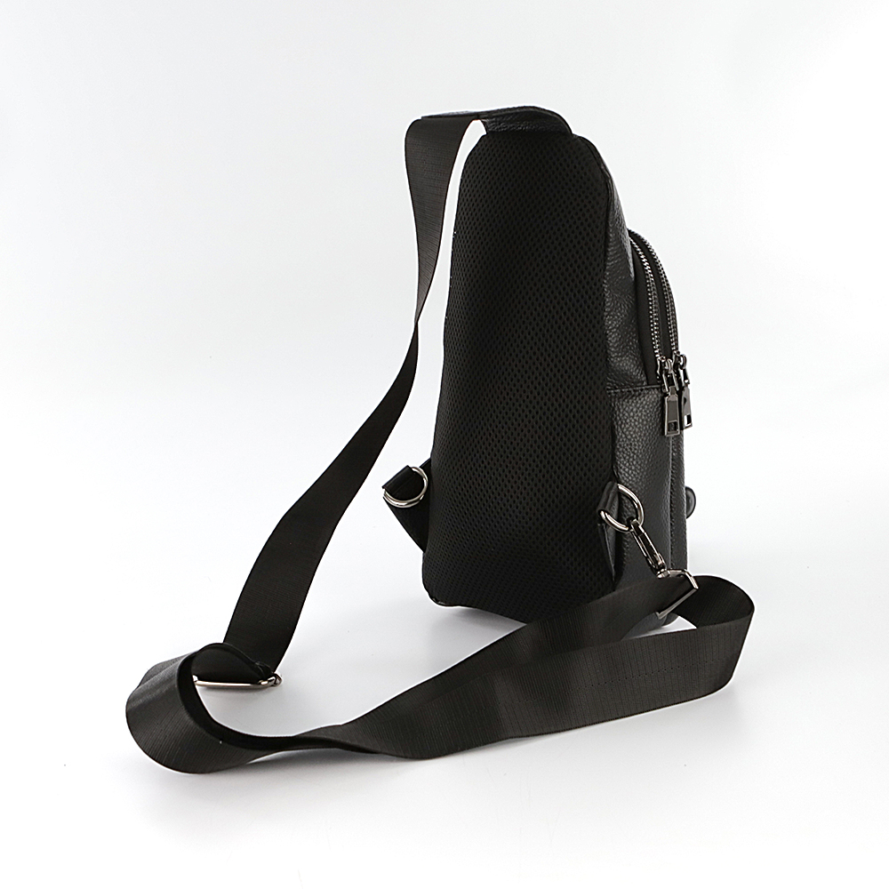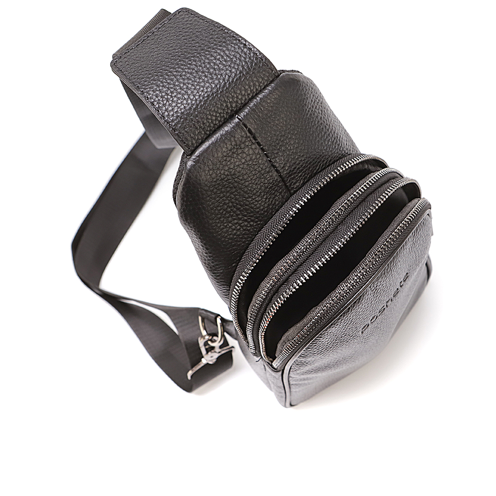 Однолямочный рюкзак от торговой марки Poshete из натуральной кожи черного цвета. Модель с регулируемым плечевым ремнем с карабином, благодаря чему рюкзак можно носить как на правом, так и на левом плече. Два отделения на молнии, с текстильной подкладкой; в одном из них – накладной карман. Спинка с дышащим сетчатым верхним слоем.