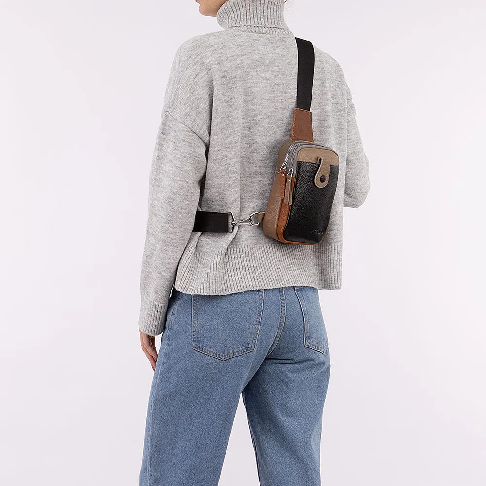 Однолямочный рюкзак от торговой марки Poshete из натуральной кожи с разноцветными вставками. Компактная модель с широким регулируемым плечевым ремнем на карабине, благодаря чему рюкзак можно носить как на правом, так и на левом плече. Два отделения на молнии, с текстильной подкладкой. В одном из них – накладной карман. На лицевой стороне – накладной карман с хлястиком на кнопке.