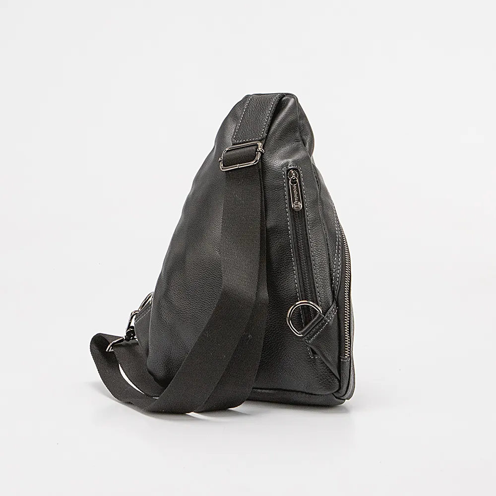 Однолямочный рюкзак от торговой марки Poshete из натуральной кожи черного цвета. Модель с регулируемой плечевой лямкой на карабине, что позволяет носить рюкзак как на левом, так и на правом плече. Отделение на молнии с боковым открытием. Внутри: фирменная подкладка, карман на молнии. На лицевой стороне – вместительный боковой карман на молнии. На спинке – вертикальный карман на молнии.