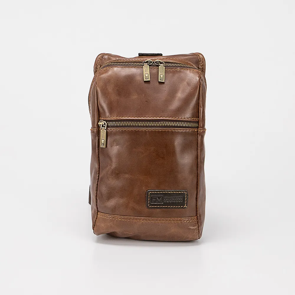 Однолямочный рюкзак от торговой марки Francesco Molinary из натуральной кожи коричневого цвета. Модель с широкой регулируемой плечевой лямкой с карабином, благодаря чему рюкзак можно носить как на правом, так и на левом плече. Отделение на молнии, с фирменной подкладкой. На лицевой и задней сторонах – карман на молнии.