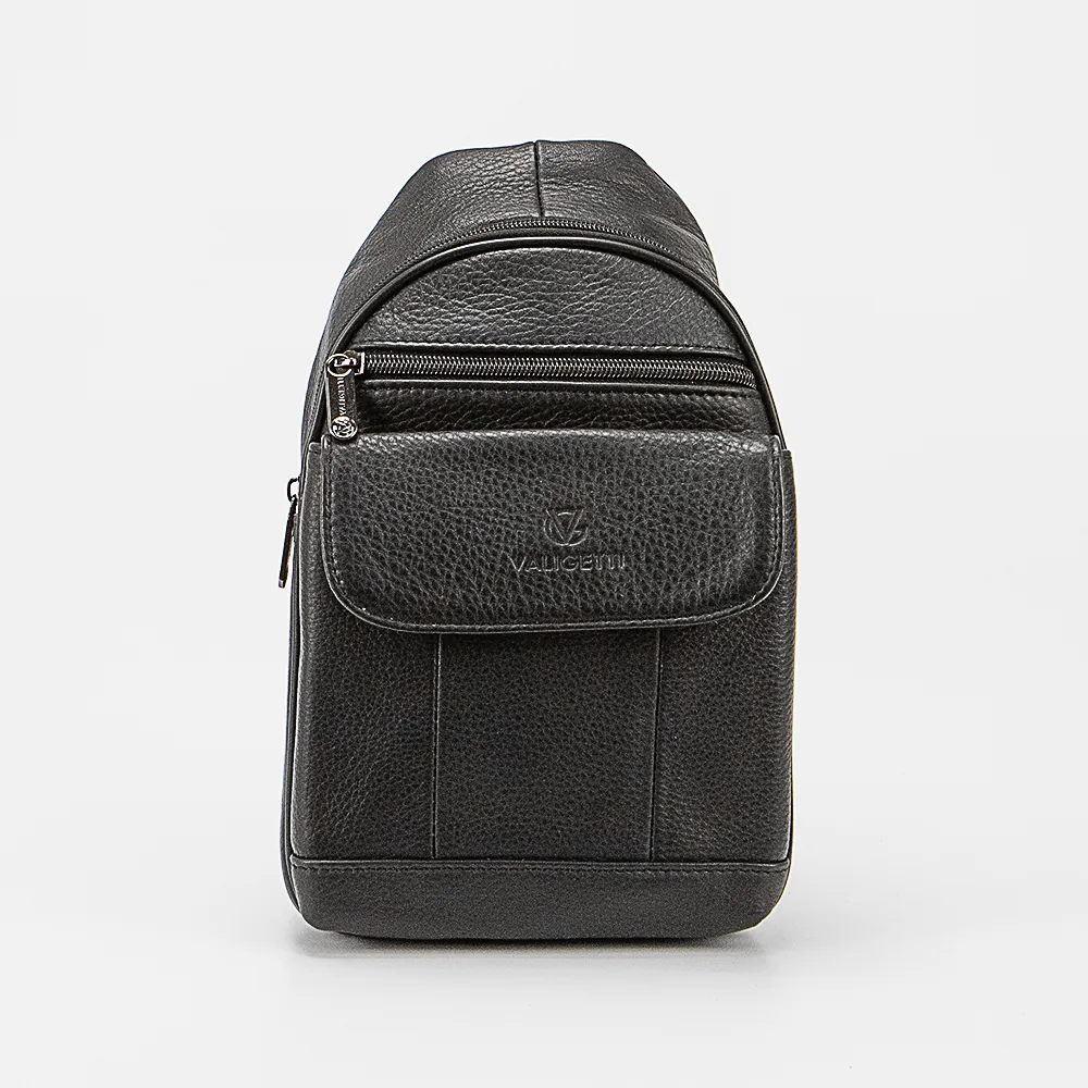 Однолямочный рюкзак от торговой марки Valigetti из натуральной кожи черного цвета. Модель с регулируемой плечевой лямкой. Отделение на молнии. На лицевой стороне – карман на молнии, накладной карман с клапаном. На спинке – карман на молнии.