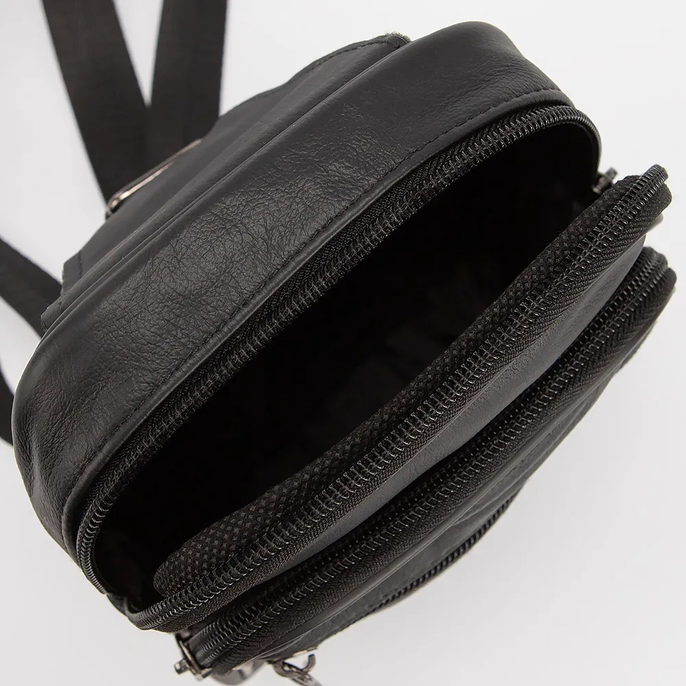 Однолямочный рюкзак от торговой марки Valigetti выполнен из натуральной кожи черного цвета. Модель с широкой регулируемой плечевой лямкой. Отделение на молнии. С лицевой стороны - два кармана на молнии. С задней стороны - карман на молнии.