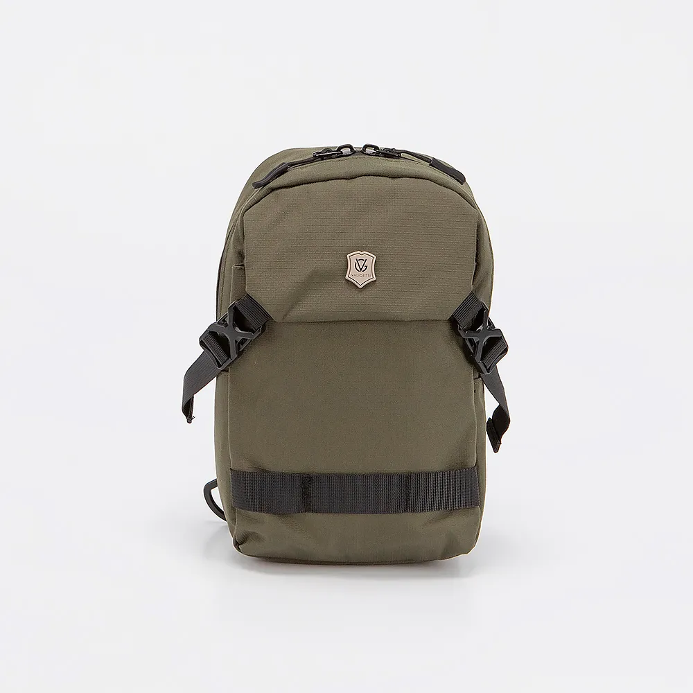Однолямочный рюкзак от торговой марки Valigetti из текстильного материала цвета хаки. Модель с регулируемой плечевой лямкой. Отделение на молнии. Внутри: текстильная подкладка, карман на молнии. На лицевой стороне - карман с клапаном, закрывающимся на застежки фастекс. На задней стороне - вертикальный карман на молнии.
