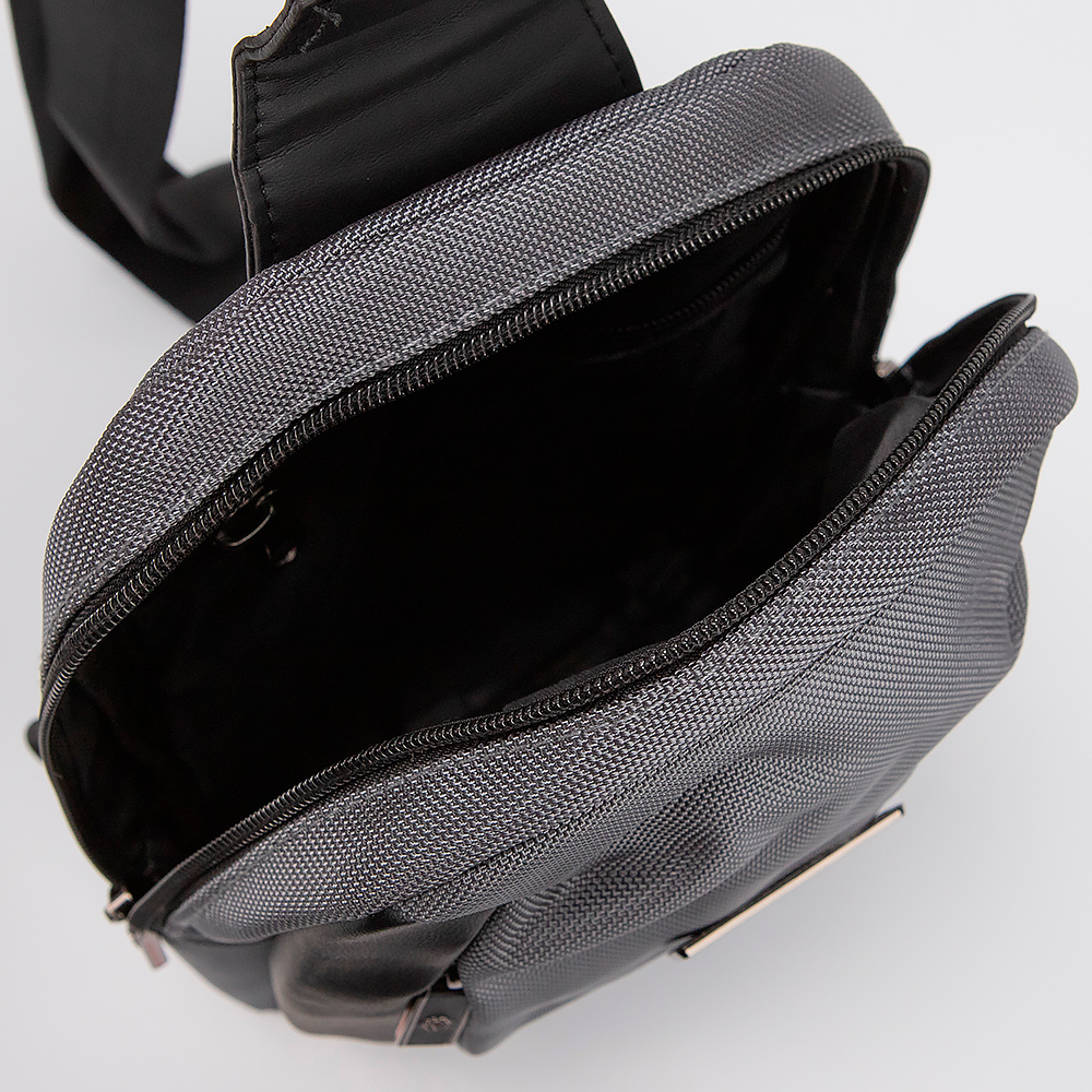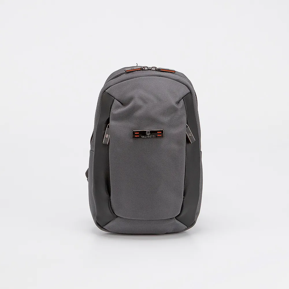 Однолямочный рюкзак от торговой марки Valigetti выполнен из плотного текстильного материала серого цвета. Модель с широкой регулируемой плечевой лямкой . Отделение на молнии. Внутри: накладной карман, карман на молнии. На лицевой стороне - два вертикальных кармана на молнии.