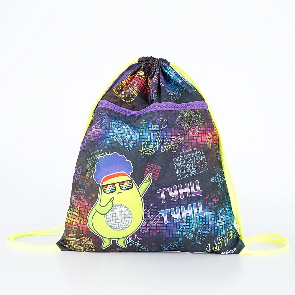 Мешок для обуви от торговой марки Оникс из текстильного материала. Декорирован оригинальным ярким принтом с изображением авокадо. Мо дель с дополнительным карманом на молнии и вентилируемой сетчатой вставкой. Затягивается шнурками, выполняющими роль плечевых лямок. Удобный практичный аксессуар для сменной обуви, спортивных тренировок, прогулок и походов.