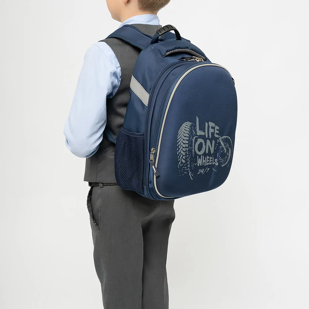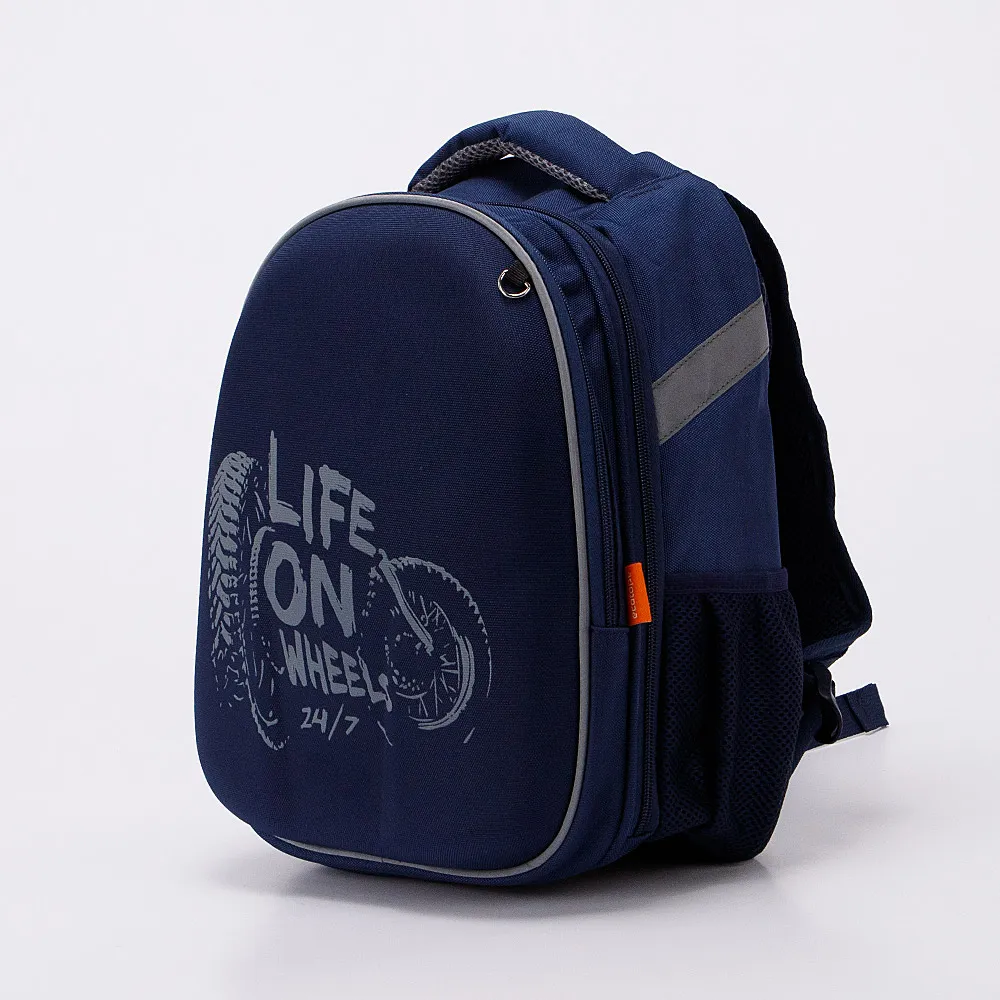Ранец от торговой марки Ecotope из практичного текстильного материала. Формованная лицевая панель декорирована принтом с изображением мотоцикла и надписью: «Life on wheels»; имеется кольцо для крепления брелока. Модель с лямкой-переноской и мягкой набивной ручкой, широкими регулируемыми плечевыми лямками со светоотражателями, повышающими безопасность в темное время, и с нагрудными ремнями, равномерно распределяющими нагрузку. Спинка с анатомическими вставками с дышащим верхним сетчатым слоем. Два отделения на молнии, с текстильной подкладкой. В основном отделении – накладной карман с уплотненной стенкой. В переднем отделении – органайзер. По бокам – карман-сетка и светоотражающая лента. Дно оснащено прорезиненными ножками для устойчивости и защиты от износа.