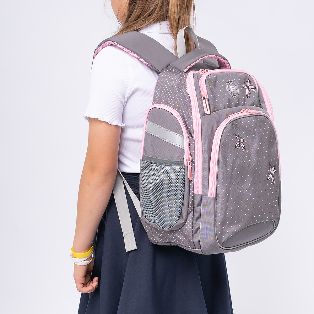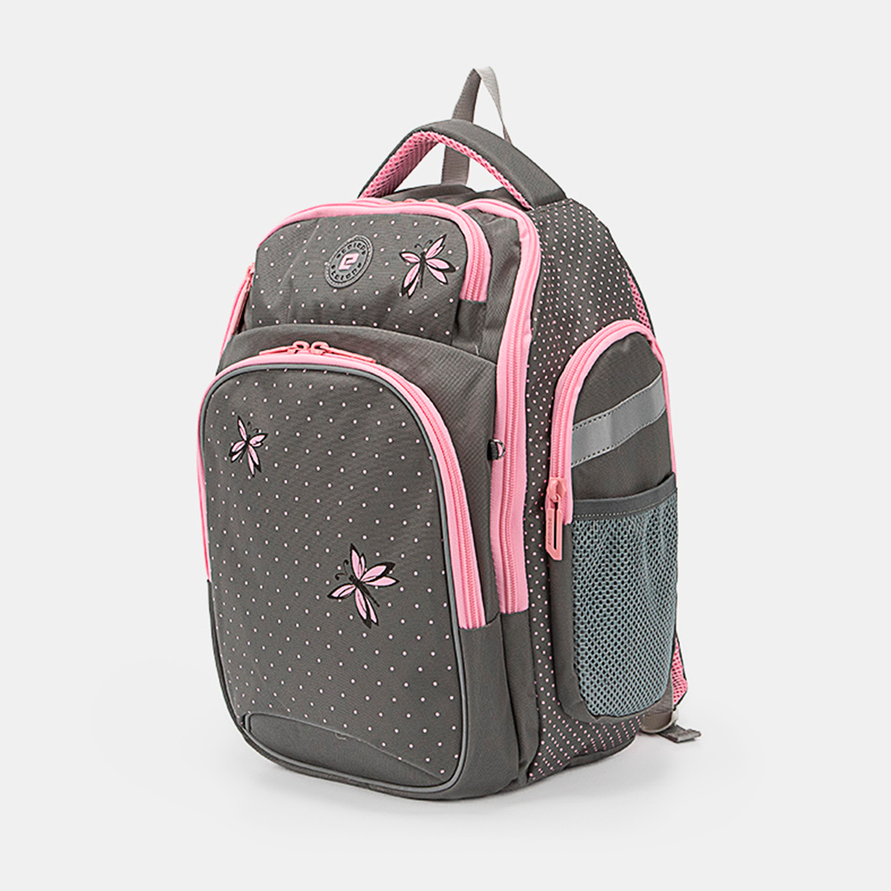Рюкзак от торговой марки Ecotope из практичного текстильного материала в сочетании серого и розового цвета. Декорирован принтом «в горошек» с изображением бабочек. Модель с лямкой-переноской, мягкой удобной набивной ручкой, регулируемыми плечевыми лямками более прочной конструкции в форме майки, с нагрудными фиксаторами для равномерного распределения нагрузки. Спинка с анатомическими вставками и дышащим верхним сетчатым слоем. Отделение на молнии. Внутри: текстильная подкладка, накладной карман с уплотненной стенкой и фиксатором на липучке. На лицевой стороне – вместительный карман на молнии; внутри: органайзер для хранения мелких предметов и канцелярии. В верхней части – карман-пенал. По бокам – карман на молнии, карман-сетка. Спереди, по бокам и на спинке имеются светоотражающие элементы, повышающие безопасность в темное время.