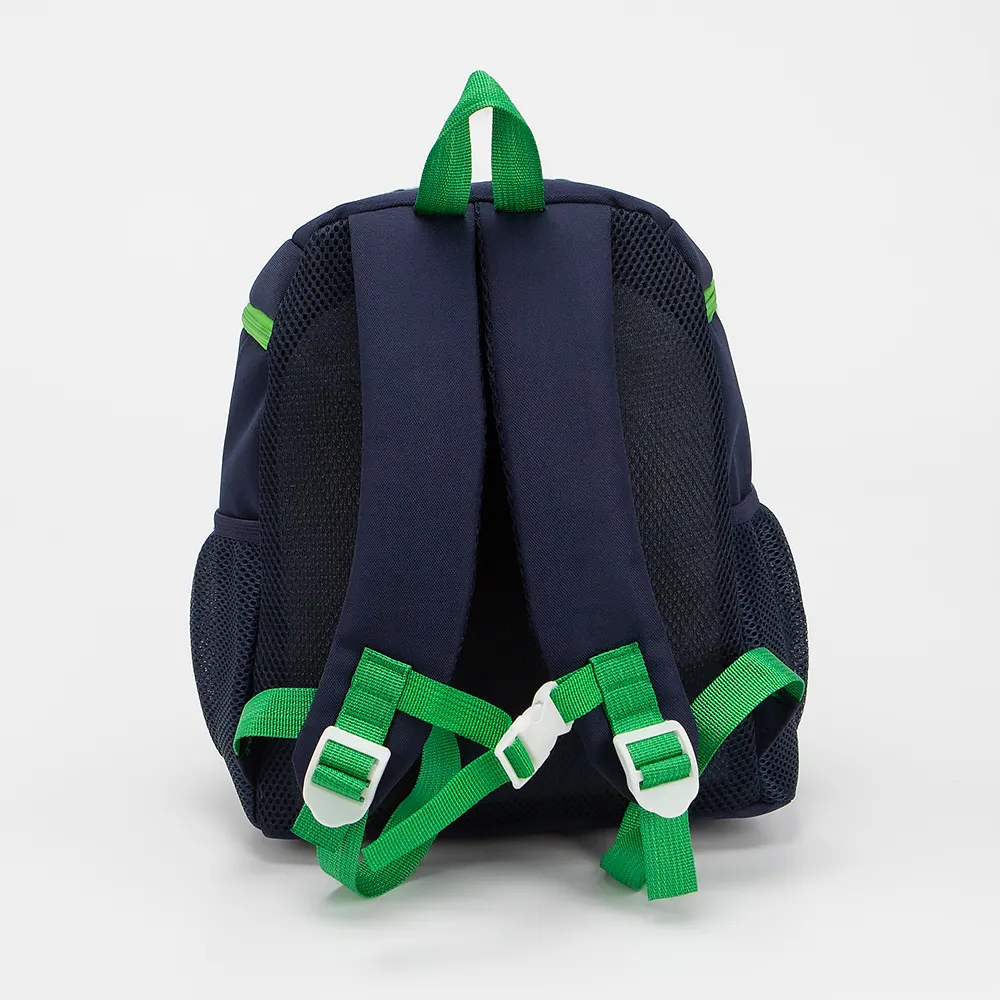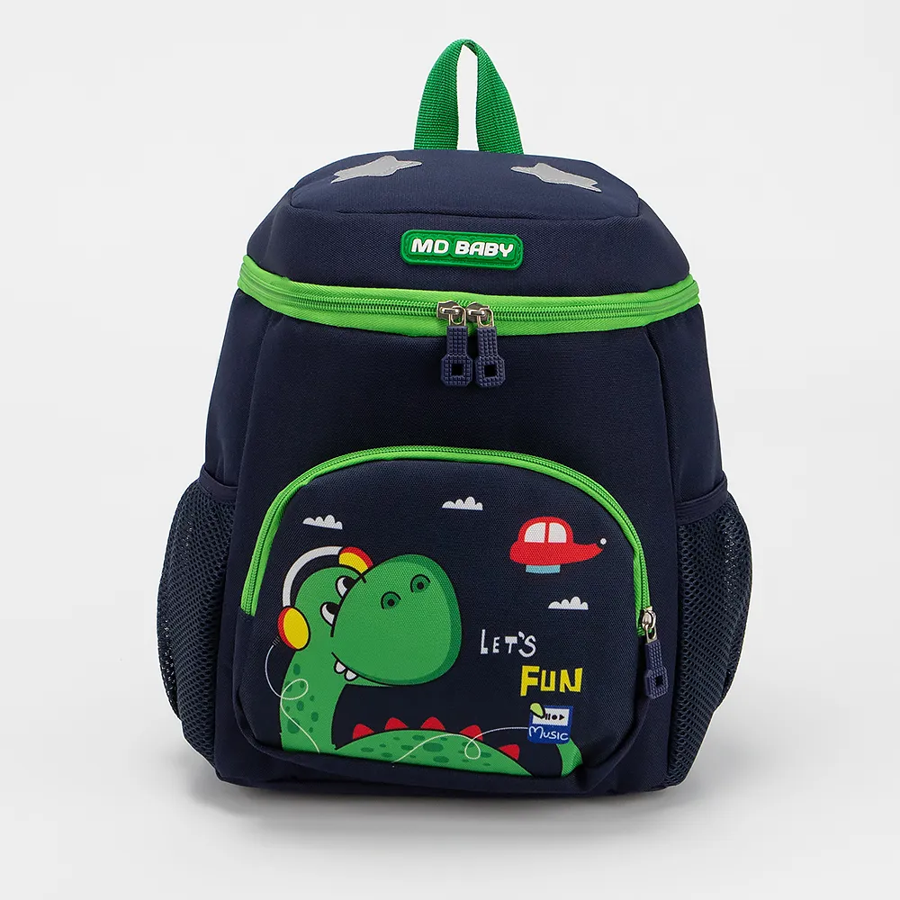 Детский рюкзак от торговой марки Ecotope из текстильного материала синего цвета с изображением динозавра. Модель с лямкой и регулируемыми плечевыми лямками, дополнительно фиксирующимися на груди ремнями с застежкой фастекс. Отделение на молнии. Внутри: текстильная подкладка, накладной карман. На лицевой стороне - накладной карман на молнии. По бокам - карман-сетка.