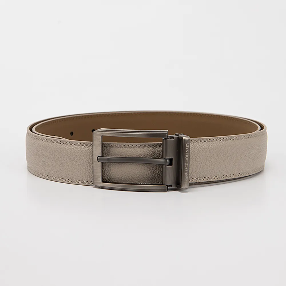 Мужской ремень от торговой марки Francesco Molinary из натуральной кожи светло-серого цвета. Модель с металлической пряжкой и шлевкой, двойной строчкой по краям; ширина: 3,3 см, длина: 105-110 см.