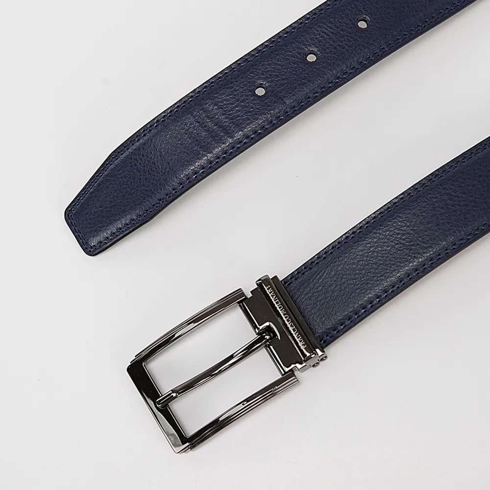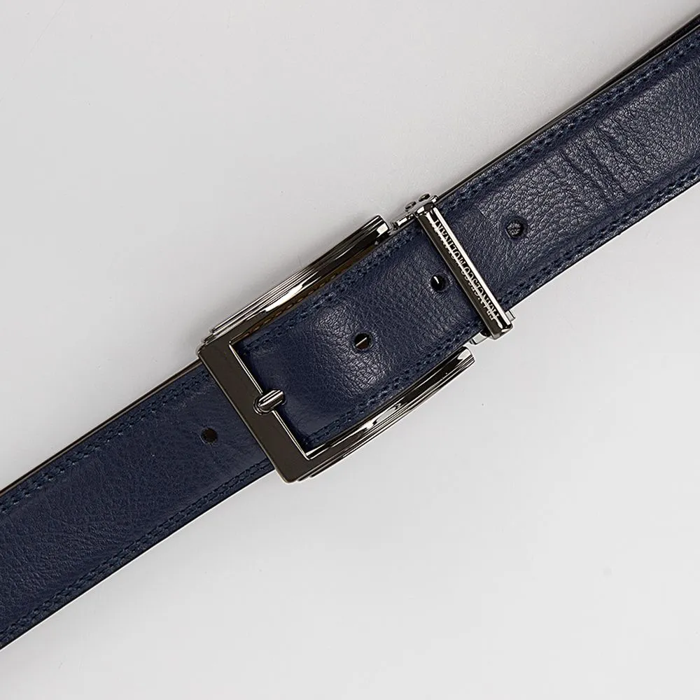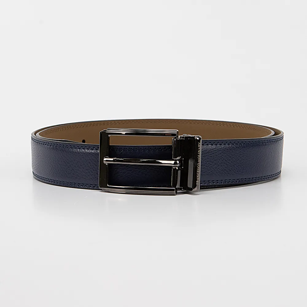 Мужской кожаный ремень от торговой марки Francesco Molinary из натуральной кожи синего цвета. Модель с металлической пряжкой и шлевкой, двойной строчкой по краям; ширина: 3,3 см, длина: 111-115 см.