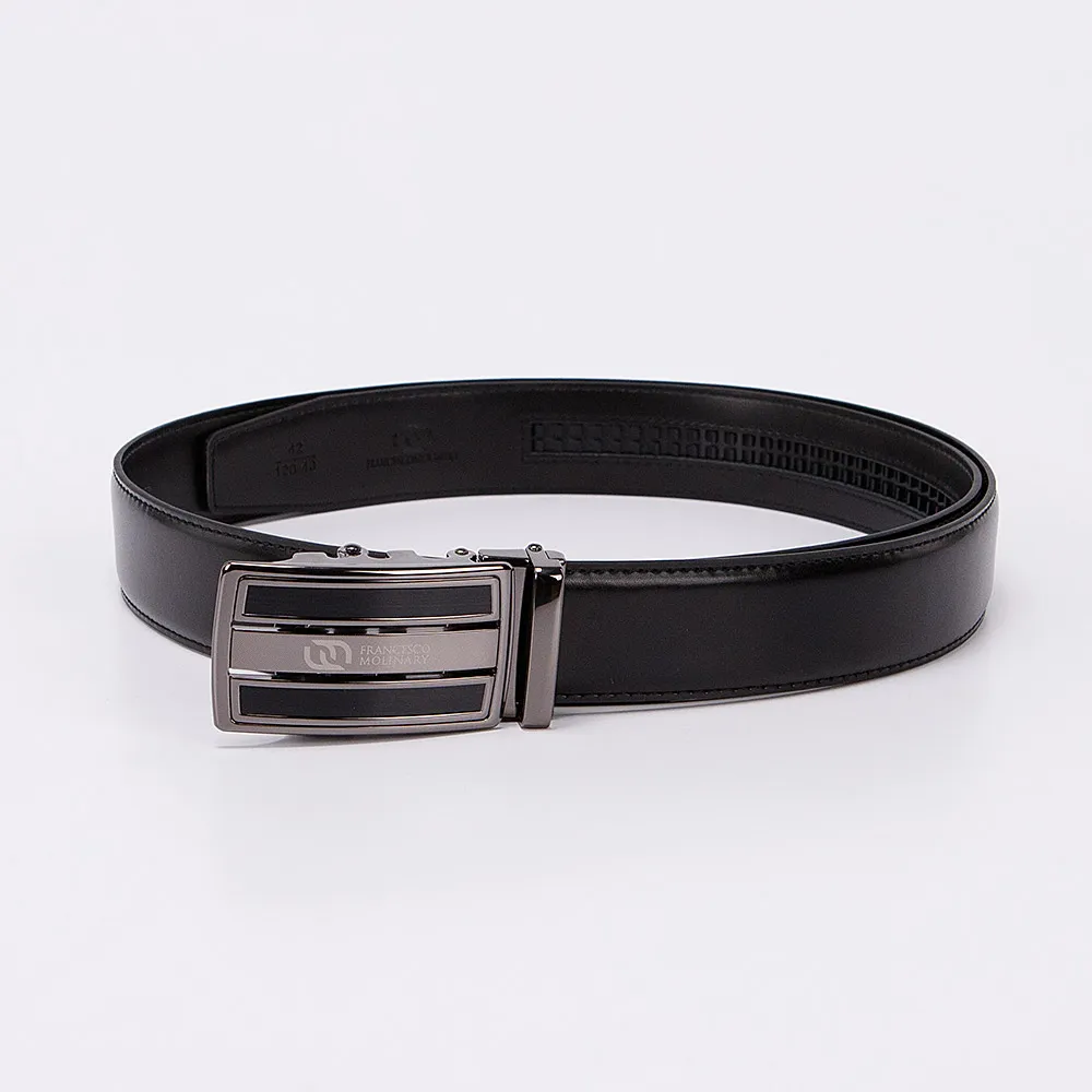Незаменимый аксессуар в гардеробе каждого мужчины это ремень с пряжкой автомат. Модель из натуральной мягкой кожи чёрного цвета, пряжка металлическая блестящего чёрного цвета с тиснением логотипа Francesco Molinary. Ремень имеет двойной металлический держатель для дополнительной фиксации, на конце ремень трапециевидной формы. Модель длиной 111-115 см и шириной 3,3 см.