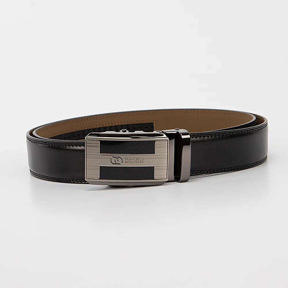 Прочный кожаный ремень прошит двойной строчкой, имеет тёмно-синий цвет и тиснение под крокодила, с оборотной стороны светлый. Подойдёт как к джинсам так и брюкам. Металлическая матовая пряжка автомат с тиснением и гравирована логотипом бренда Francesco Molinary. Ремень имеет металлический держатель для дополнительной фиксации, на конце ремень трапециевидной формы. Модель длиной 105-110 см и шириной 3,3 см.