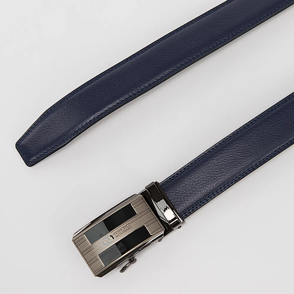 Прочный кожаный ремень прошит двойной строчкой, имеет тёмно-синий цвет и тиснение под крокодила, с оборотной стороны светлый. Подойдёт как к джинсам так и брюкам. Металлическая матовая пряжка автомат с тиснением и гравирована логотипом бренда Francesco Molinary. Ремень имеет металлический держатель для дополнительной фиксации, на конце ремень трапециевидной формы. Модель длиной 105-110 см и шириной 3,3 см.