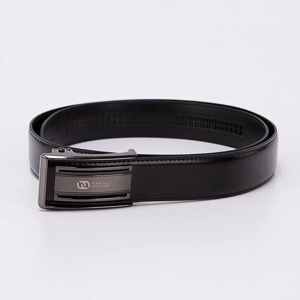 Мужской ремень от торговой марки Francesco Molinary из натуральной гладкой кожи черного цвета. Модель шириной 3,3 см, длиной 105-110 см. Металлическая пряжка-автомат декорирована гравировкой с названием бренда.
