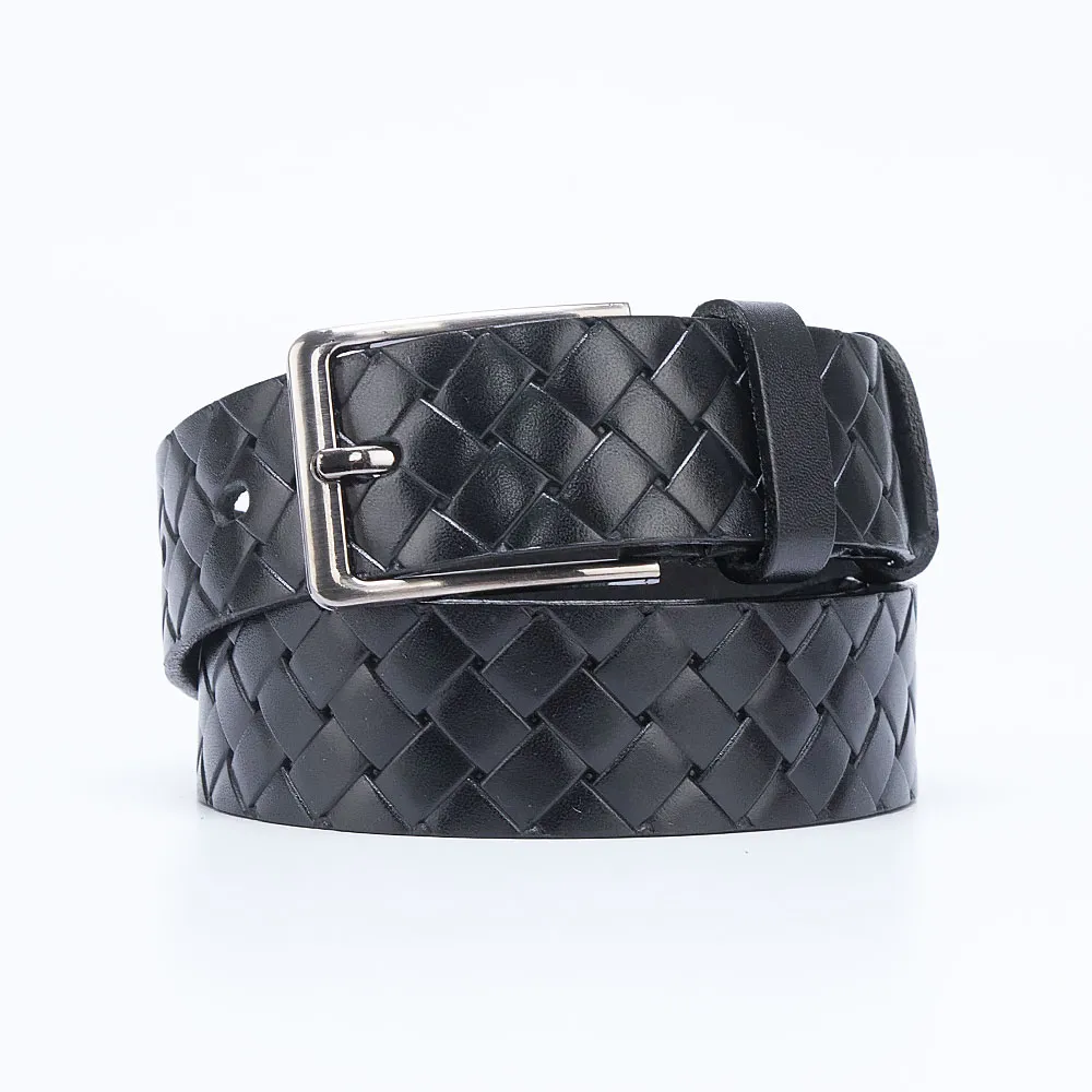 Ремень от торговой марки Poshete из натуральной кожи черного цвета с тиснением под плетение. Модель с металлической пряжкой и двумя шлевками; ширина - 3 см, длина – 86-100 см.