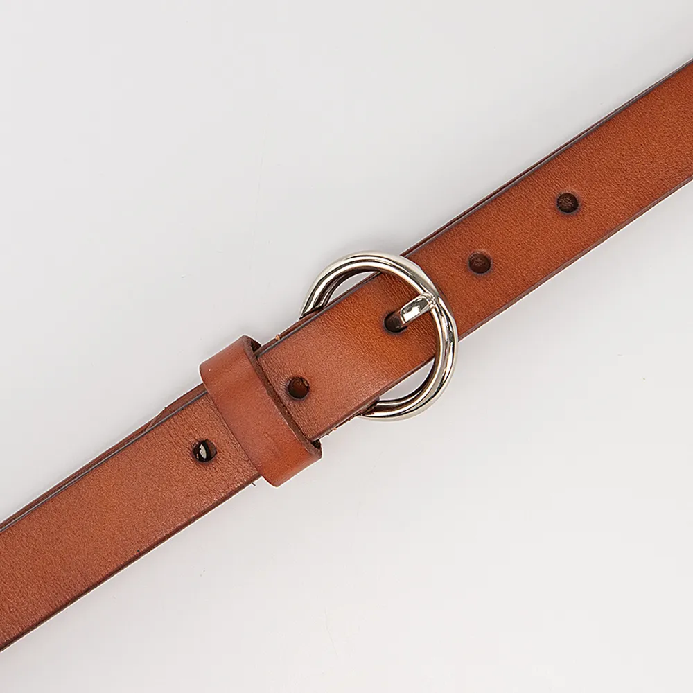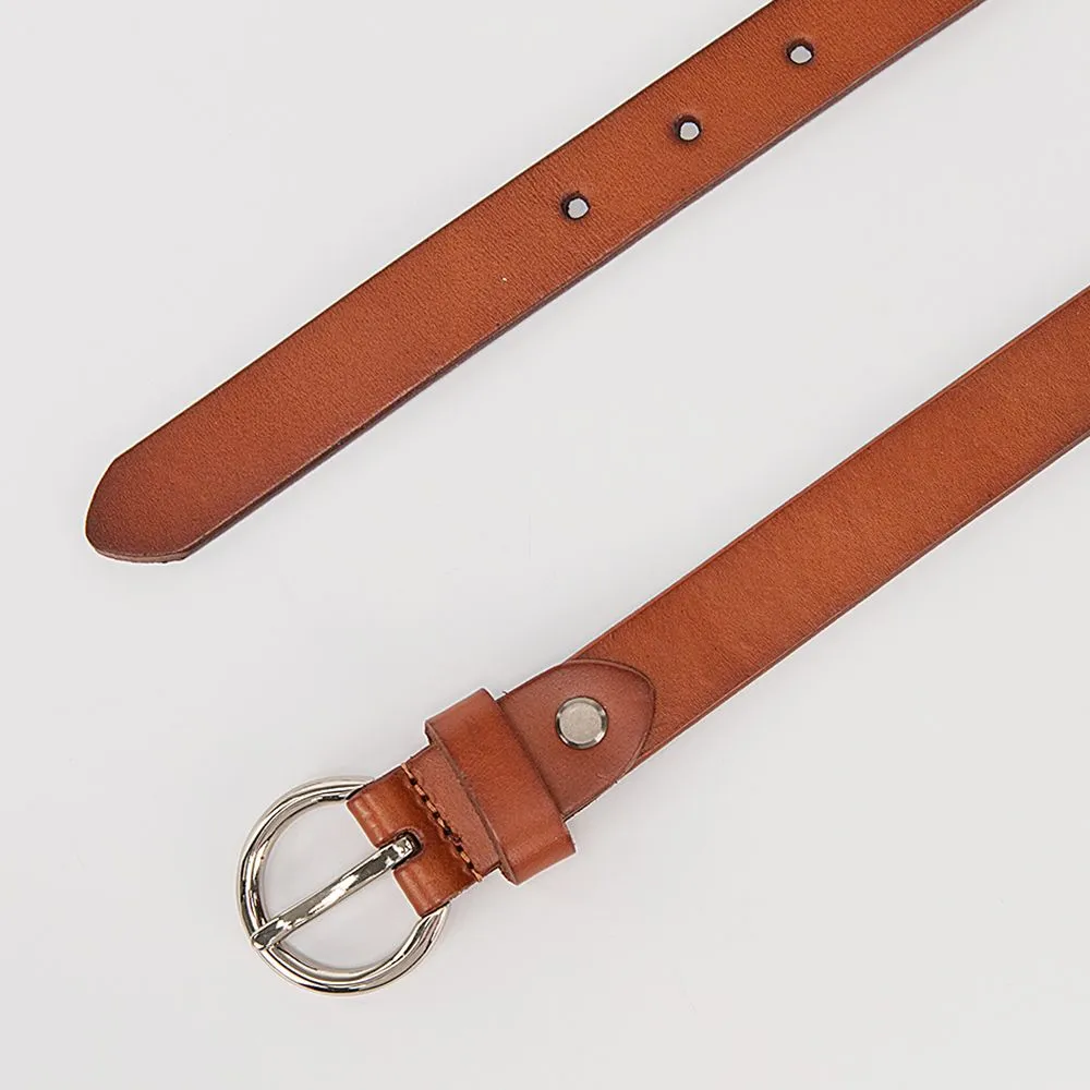 Ремень от торговой марки Poshete из натуральной кожи ярко-коричневого цвета. Модель длиной 106-110 см, шириной 2,5 см. Металлическая пряжка круглой формы; шлевка для фиксации.