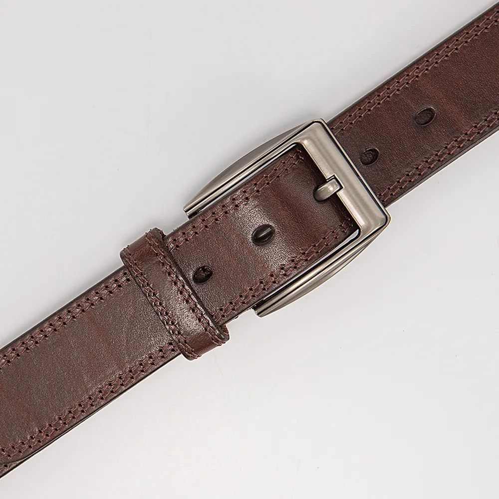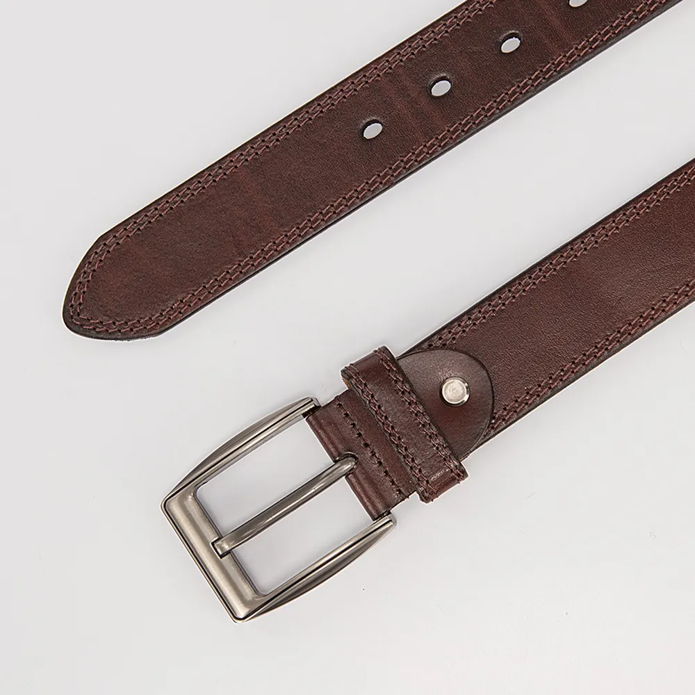 Стильный мужской ремень от бренда Poshetе выполнен из натуральной мягкой кожи коричневого цвета и декорирован двойной отстрочкой в тон. Модель с открытой серебристой пряжкой. Модель длиной 105-110 см и шириной 3,8 см.