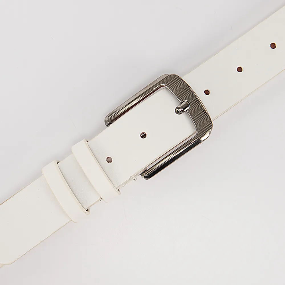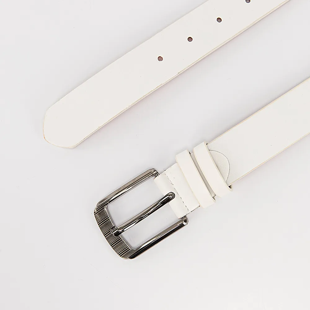 Мужской ремень под брюки выполнен из гладкой искусственной кожи белого цвета. Модель шириной 3,5 см, длиной 110 см, с прямоугольной классической пряжкой с одним язычком, шлевкой и отверстиями для регулирования длины. Кончик закругленной треугольной формы. Аксессуар станет идеальным завершением делового образа.