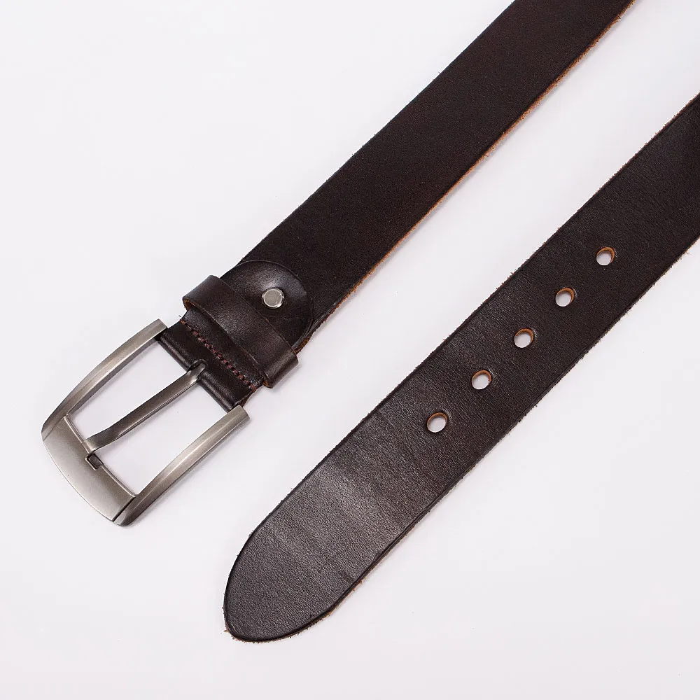 Стильный мужской ремень от бренда Poshete выполнен из натуральной толстой кожи, с оборотной стороны замшевый. Ремень коричневого цвета, ширина 4 см, длина 105-110 см. Стальная квадратная пряжка с «язычком», одна шлёвка и классические отверстия для фиксации объёма, на конце овальной формы.