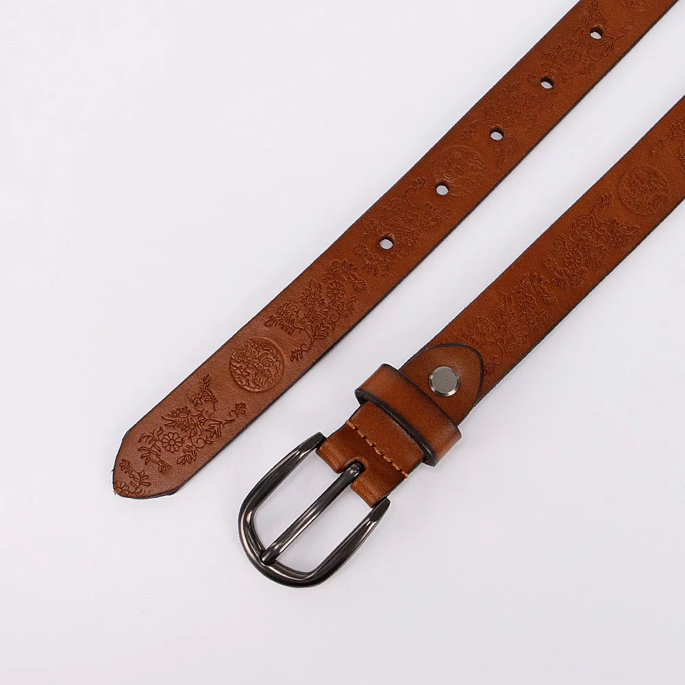 Стильный женский ремень от бренда Poshete выполнен из натуральной толстой кожи и украшен цветочным тиснением. Ремень коричневого цвета, ширина 2,5 см, длина 95-105 см. Стальная овальная пряжка с «язычком», одна шлёвка и классические отверстия для фиксации объёма, на конце овальной формы.