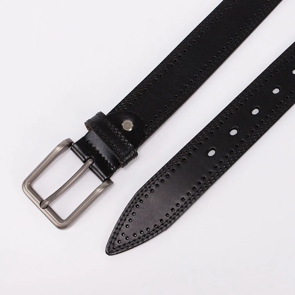 Стильный мужской ремень от бренда Poshete выполнен из натуральной толстой кожи. Ремень чёрного цвета, декорирован по канту двойной строчкой и перфорацией, ширина 3,8 см, длина 105-110 см. Стальная квадратная пряжка с «язычком», одна шлёвка и классические отверстия для фиксации объёма, на конце треугольной формы.
