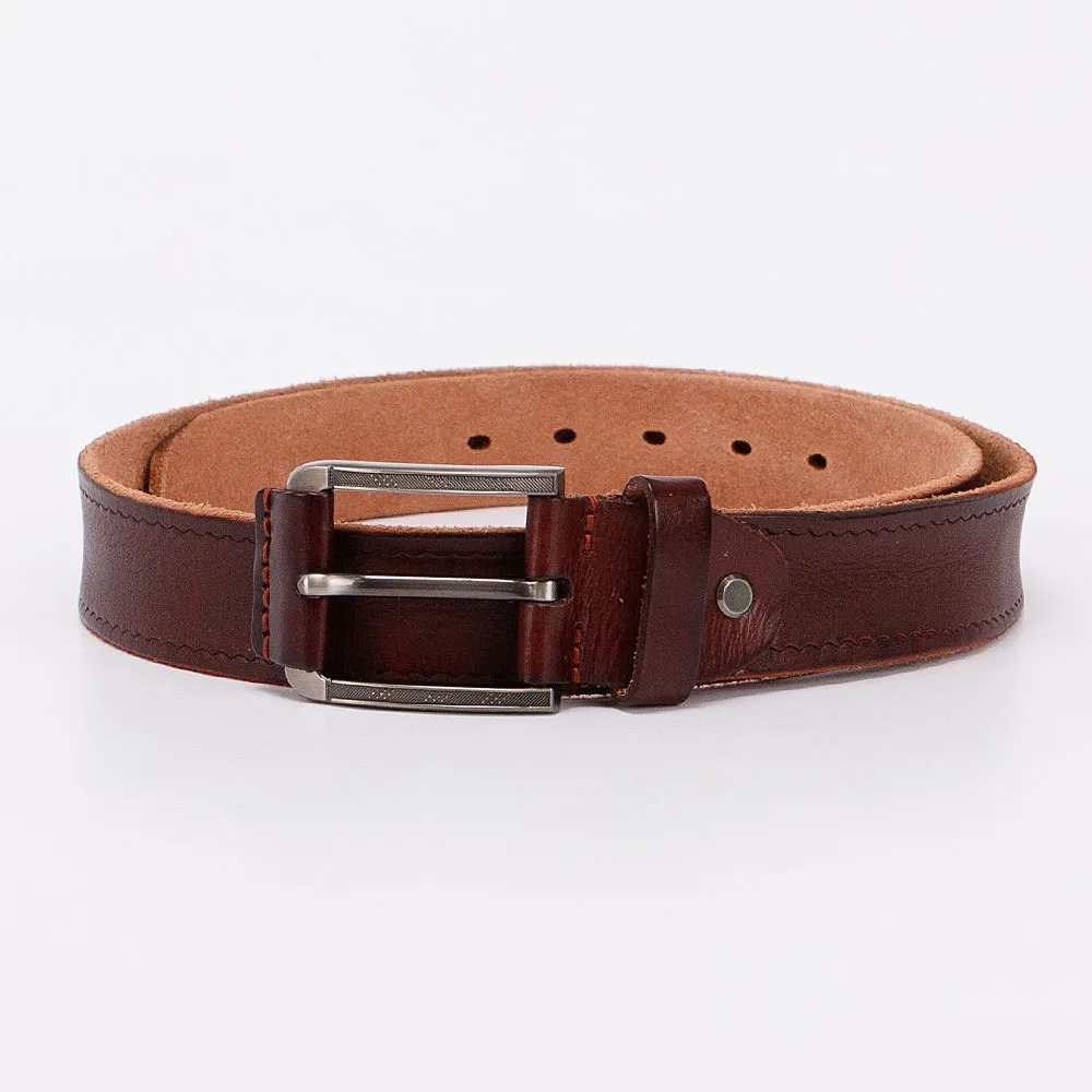 Стильный женский ремень от бренда Poshete выполнен из натуральной толстой кожи, декорирован волнистым тиснением по канту. Ремень коричневого цвета с зелёным оттенком, ширина 3,8 см, длина 95-105 см. Стальная прямоугольная пряжка с «язычком» украшена тиснением и оснащена кожаной накладкой, одна шлёвка и классические отверстия для фиксации объёма, на конце овальной формы.