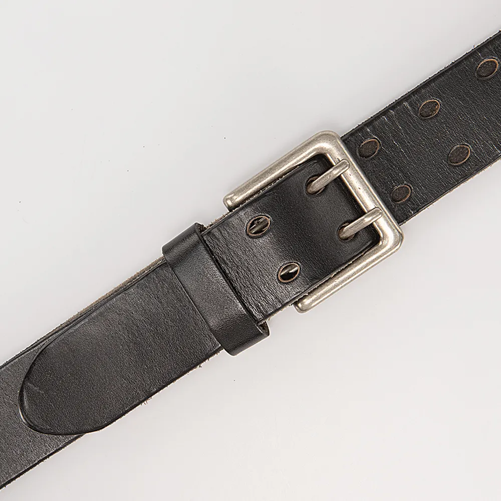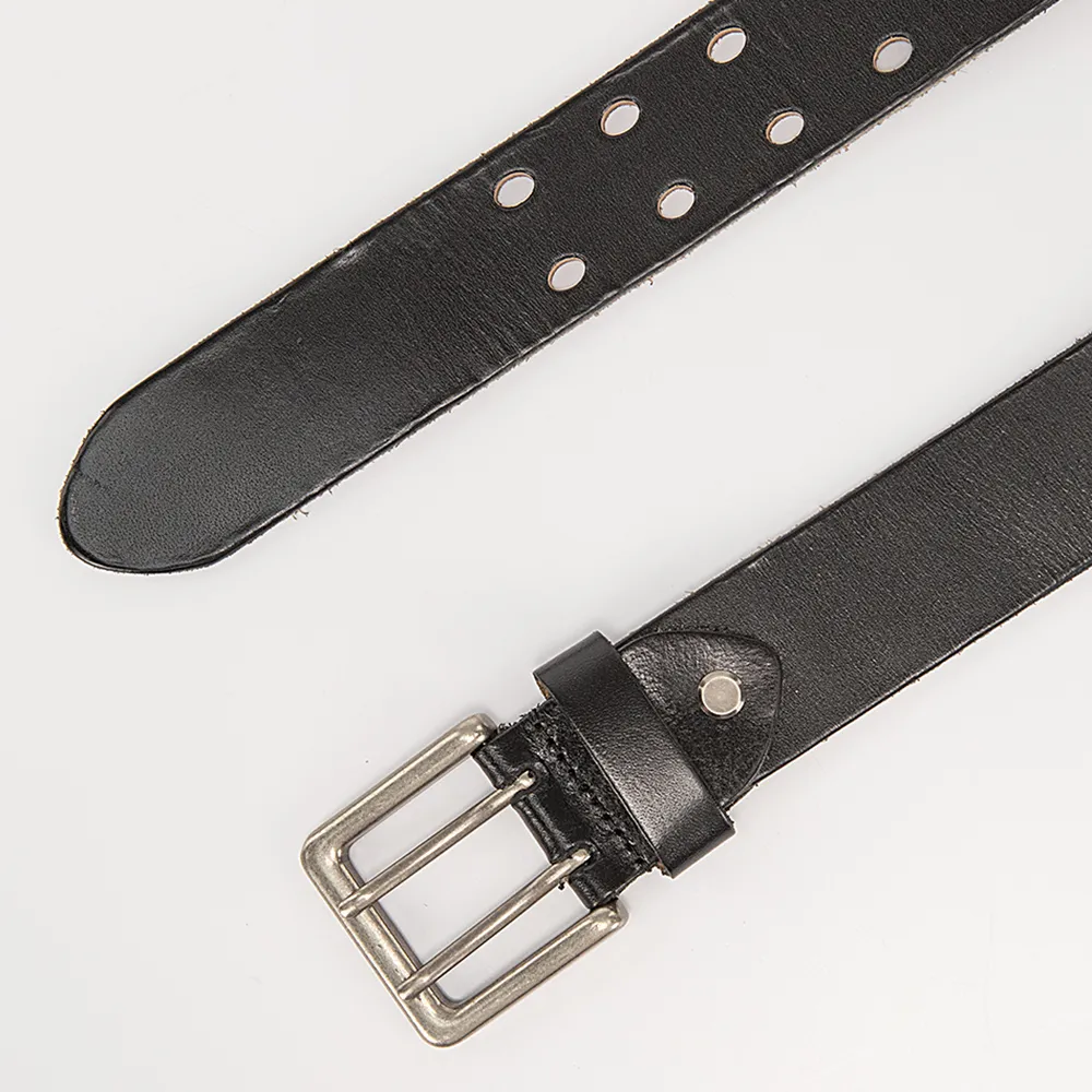 Ремень от торговой марки Poshete из натуральной кожи черного цвета. Модель шириной 38 мм, длиной 111-115 см, с одной шлевкой, крупными отверстиями. Металлическая пряжка с двумя язычками. Подойдет под джинсы.