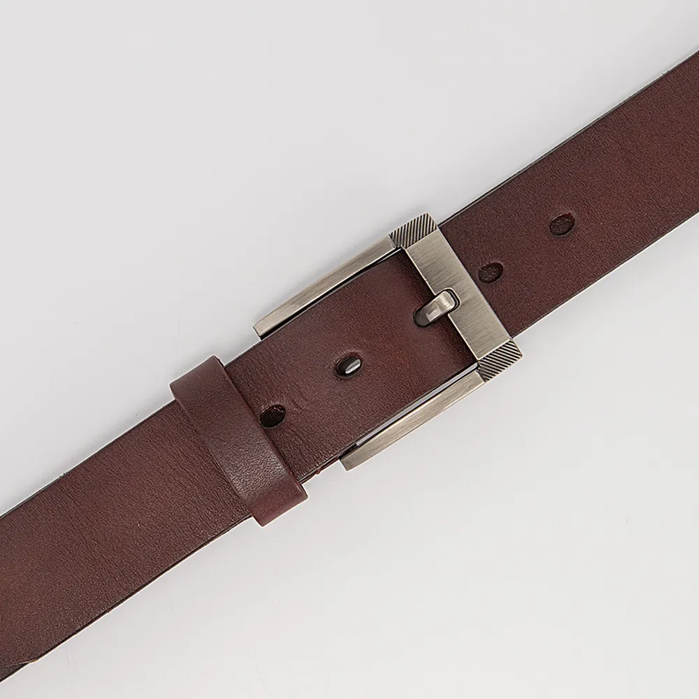 Брючный ремень от бренда Poshete выполнен из натуральной мягкой кожи классического коричневого цвета и дополнен небольшой открытой металлической пряжкой серебристого цвета и кожаной шлевкой.