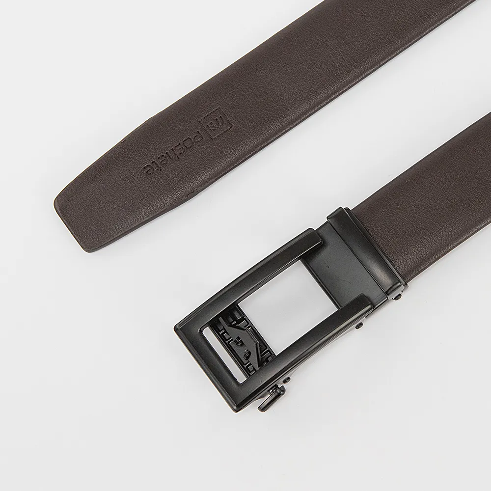 Мужской ремень от торговой марки Poshete из натуральной кожи черного цвета. Модель с металлической пряжкой-автомат цвета титаниум. Ширина: 3,6 см, длина: 105-110 см.