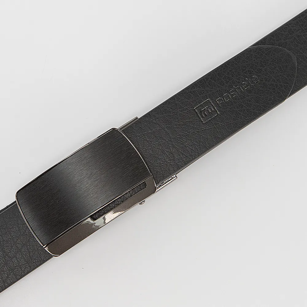 Ремень мужской Poshete выполнен из натуральной кожи в чёрном цвете. Тип застежки - металлическая пряжка автомат с чёрной вставкой и шлёвка. Украшен тиснением логотипа. Имеет ширину 3,5 см. Регулируемый объём 111-115 см.