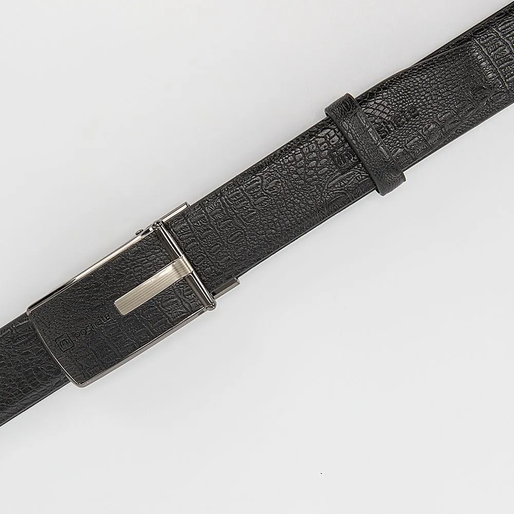 Мужской ремень от торговой марки Poshete из натуральной кожи черного цвета. Модель с пряжкой-автоматом и шлевкой; ширина - 3,5 см, длина - 116-120 см.