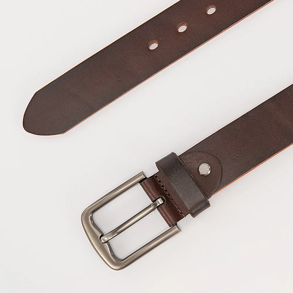 Стильный мужской ремень от бренда Poshete выполнен из натуральной толстой кожи, с оборотной стороны замшевый. Ремень коричневого цвета, ширина 3,8 см, длина 105-110 см. Стальная квадратная пряжка с классическим язычком, шлёвка не перемещается, на ремне пять отверстий для фиксации объёма, на конце полукруглой формы.