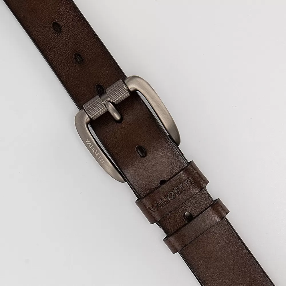 Мужской ремень бренда Valigetti из натуральной кожи коричневого цвета. Пряжка выполнена из металла и имеет матовую поверхность. Ремень оснащён двумя шлёвками. Ширина ремня — 3,8 см, длина — 130 см. Размер ремня: L.
