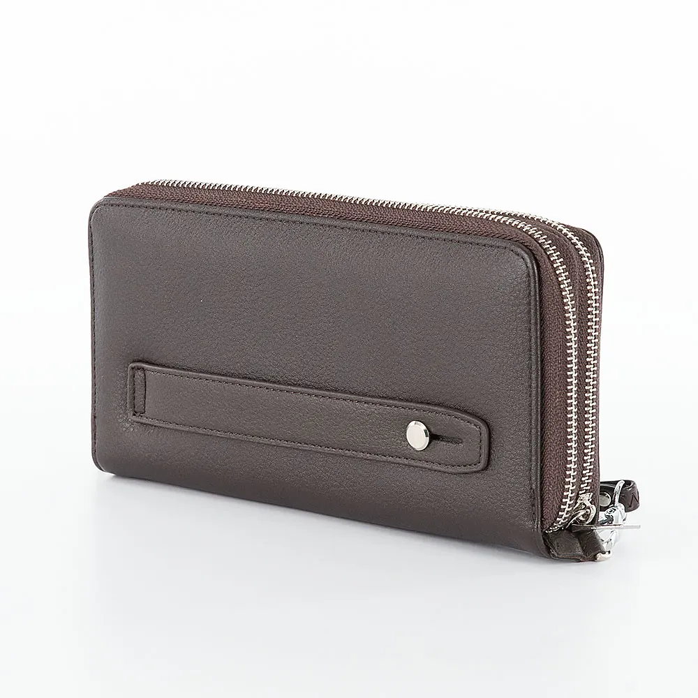 Большой мужской клатч от бренда Poshete тёмно-коричневого цвета, выполнен из искусственной матовой кожи. Имеет два основных отделения на металлических молниях, расстёгивающихся по трём сторонам. Внутри каждого - отделения для купюр и отделения на молнии для монет. Сзади удобный, плотно прилегающий ремешок для ладони.