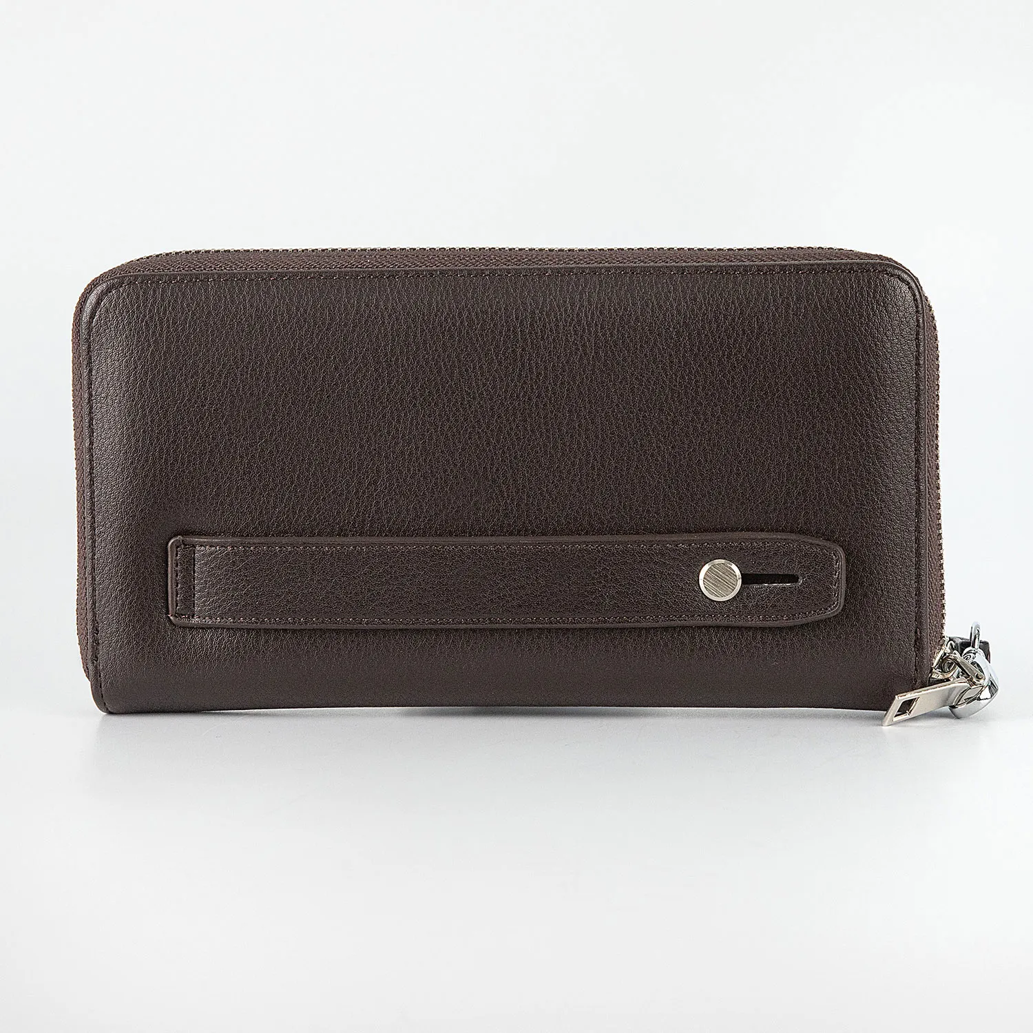 Большой мужской клатч от торговой марки Poshete выполнен из искусственной матовой кожи коричневого цвета. Модель со съемным ремешком для запястья. Отделение на молнии по трем сторонам. Внутри: четыре отделения для купюр, карманы для карт, средник на молнии для монет. На задней стороне - лямка для ношения на тыльной стороне ладони.