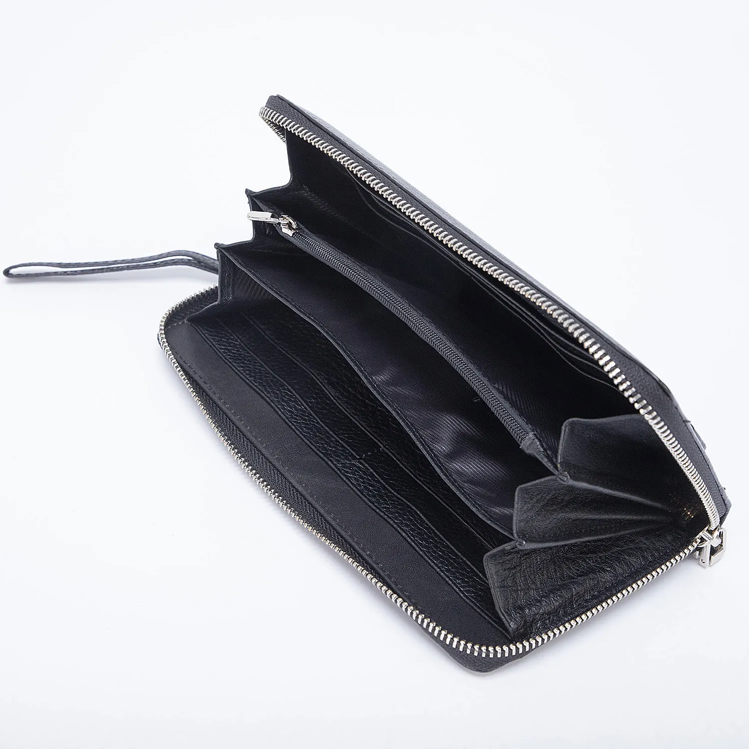 Мужской клатч от бренда Poshete чёрного цвета, выполнен из натуральной матовой кожи. Застёгивается на металлическую молнию, которая идёт по трём сторонам. Внутри четыре отделения для купюр, средник на молнии для монет и кармашки для пластиковых карт. Снаружи удобный, плотно прилегающий ремешок для ладони и короткий ремешок для запястья.