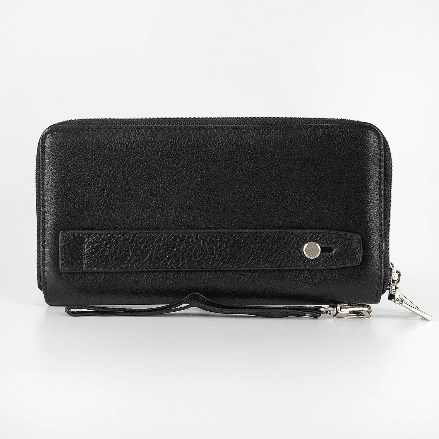 Мужской клатч от бренда Poshete чёрного цвета, выполнен из натуральной кожи. Имеет два независимых отделения на металлических молниях, молнии расстёгиваются по трём сторонам. Внутри отделения для купюр, карман на молнии для монет и кармашки для пластиковых карт.