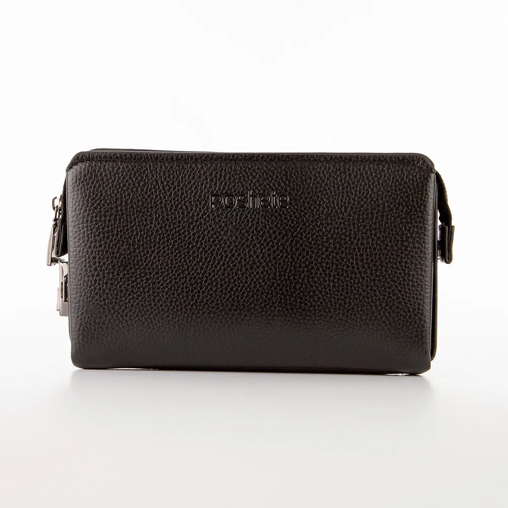 Клатч от торговой марки Poshete из искусственной кожи черного цвета. Модель с лямкой для ношения на запястье. Отделение на молнии. Молния крепится по бокам на кнопку; имеется кодовый замок. Внутри: две плотных перегородки, разделяющих на три отсека с карманом на молнии, карманами для карт и документов.