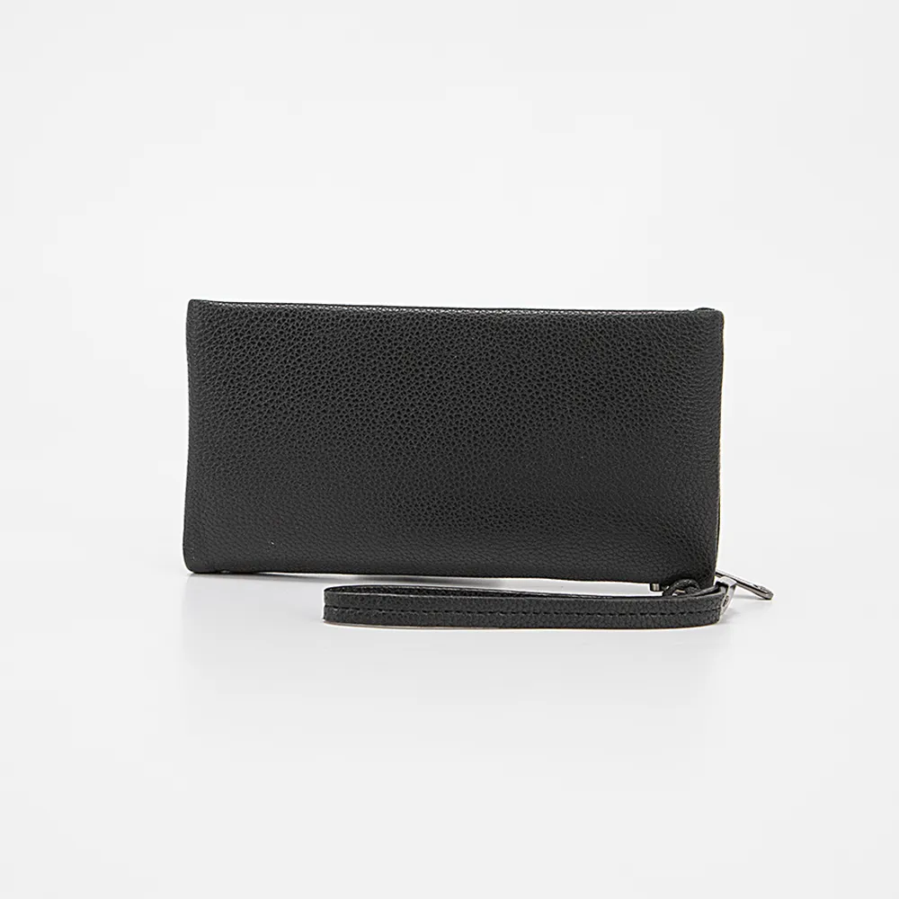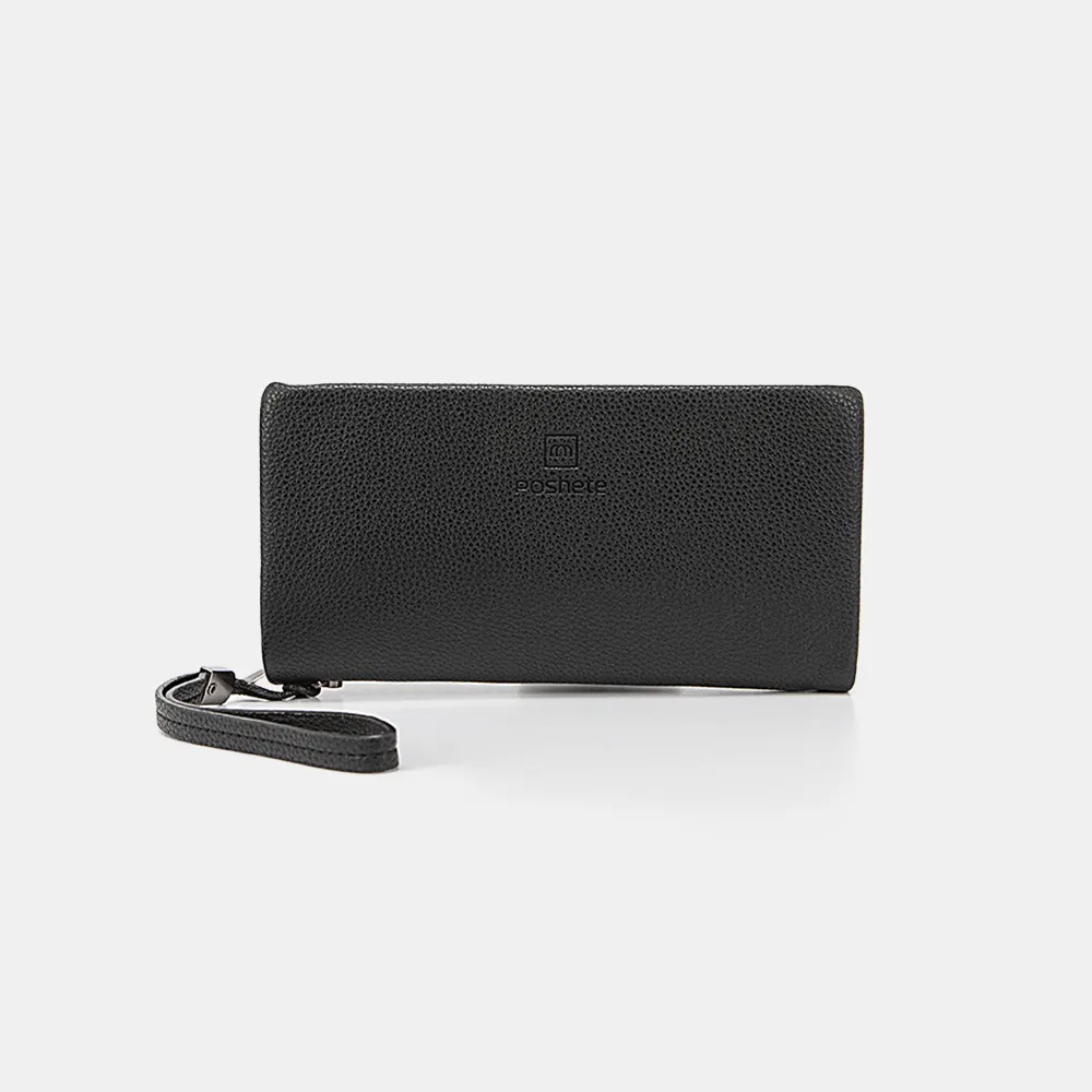 Клатч от торговой марки Poshete из искусственной кожи черного цвета. Модель со съемной ручкой для запястья. Два отделения на молнии; в одном из них – карманы для карт и купюр, карман-перегородка на молнии.