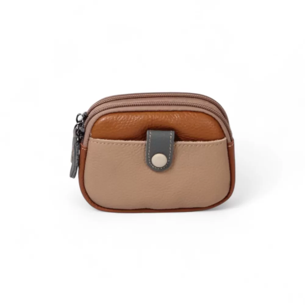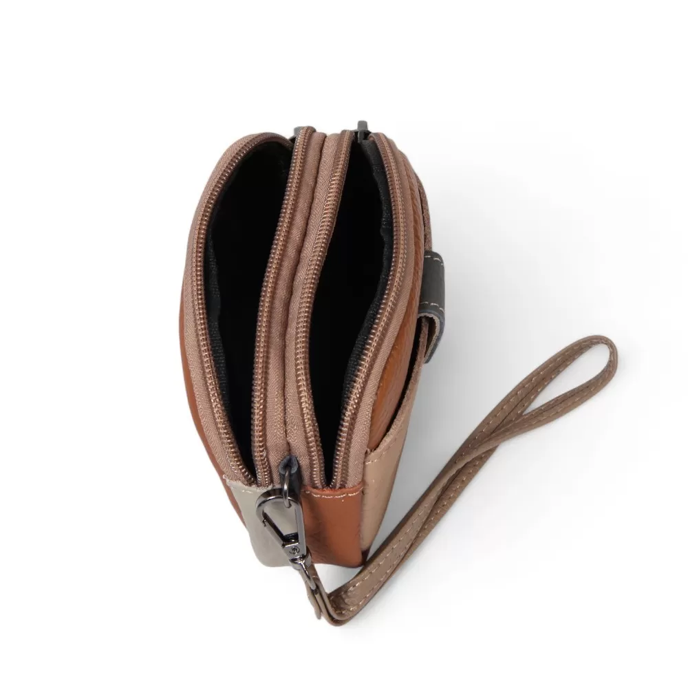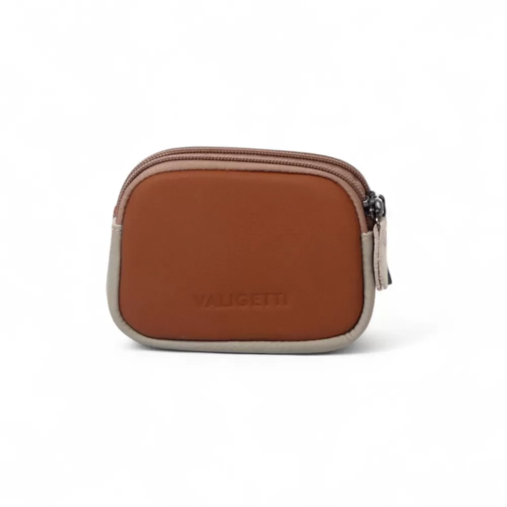 Мини-кошелек от Valigetti сделан из натуральной кожи. У него два отделения на молнии для карт и купюр, а также наружный карман с кнопкой. В комплекте — ремешок на запястье.