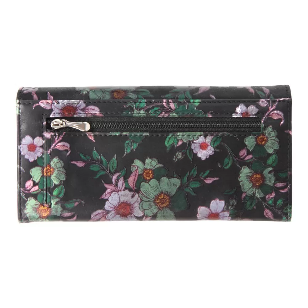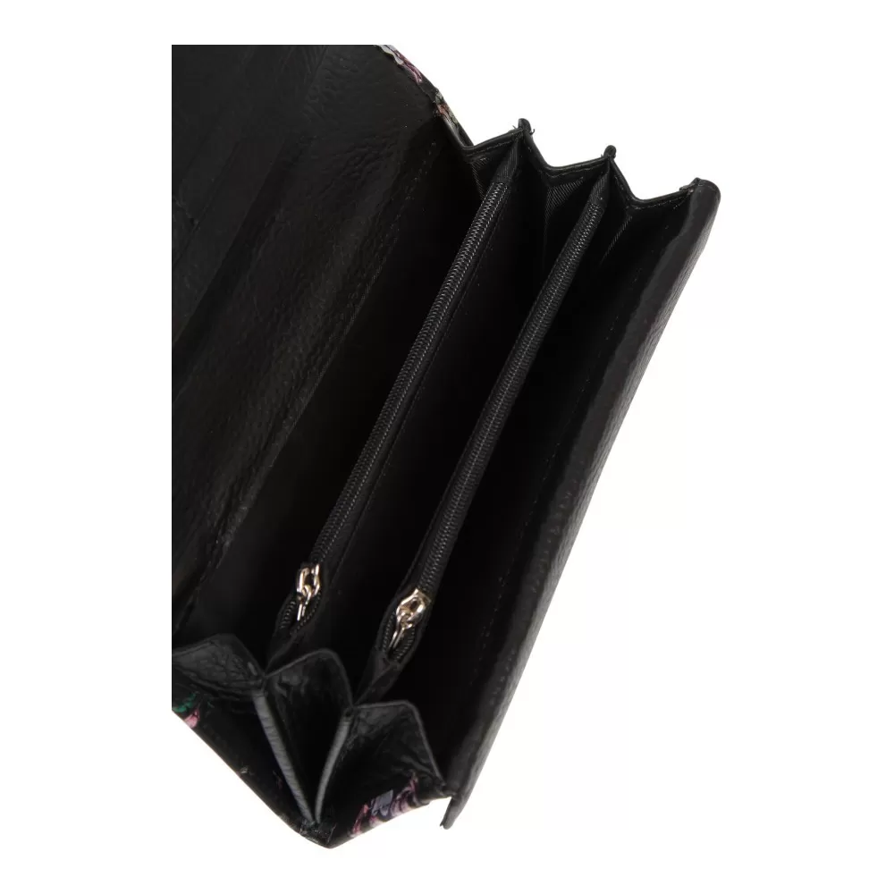 Кошелёк от бренда Valigetti изготовлен из натуральной кожи, черного цвета, украшенный цветочно-растительным орнаментом. Кошелек имеет фирменную подкладку и застегивается клапаном на магнитах. Модель имеет 3 отделения, разделенные двумя кармашками на молнии, так же дополнительно 2 отделения для купюр и 5 отделений для карт. Снаружи так же есть еще 1 карман на молнии.