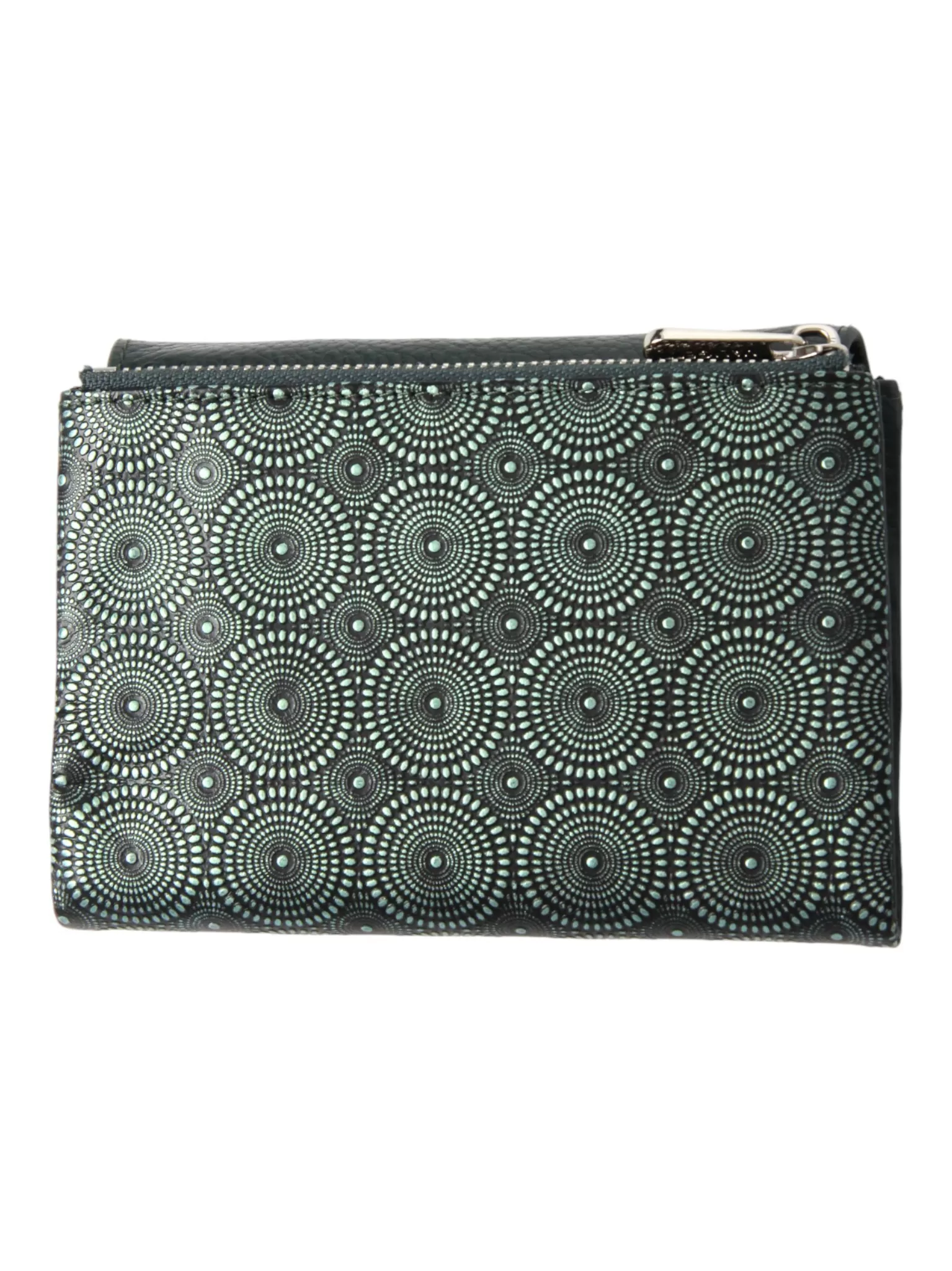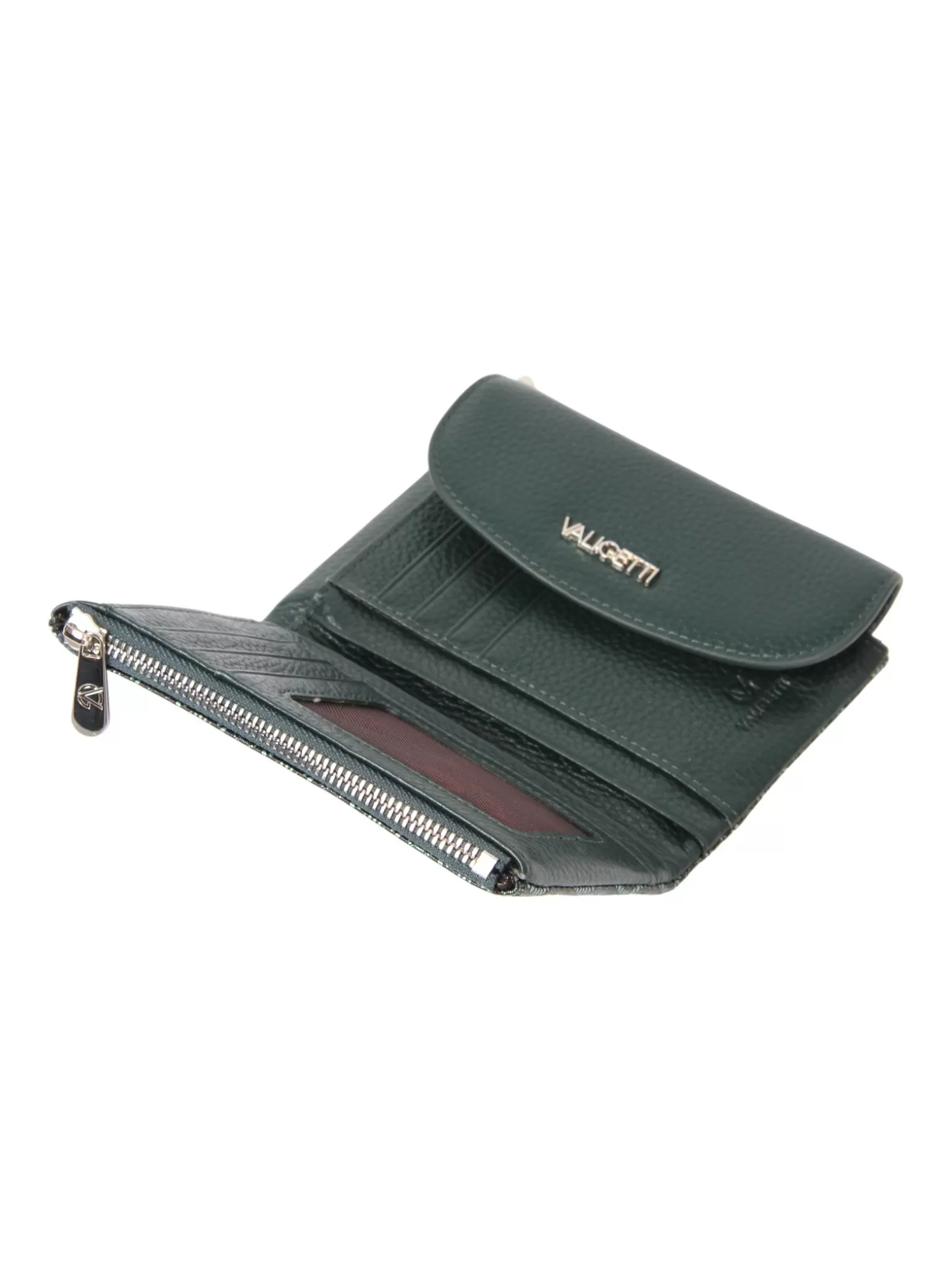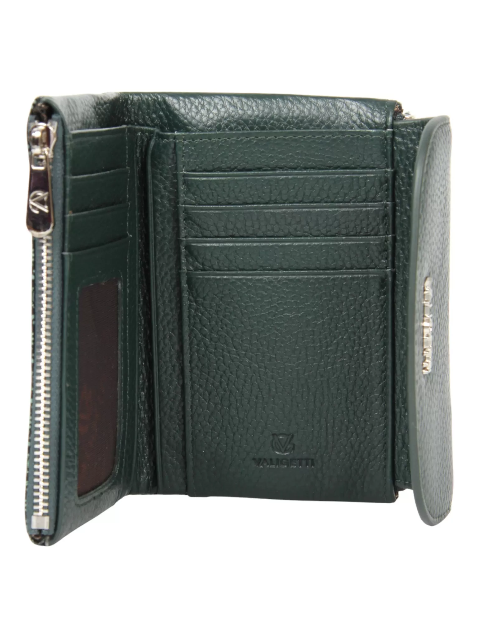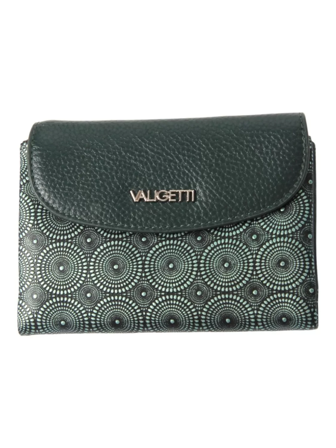 Кошелёк от бренда Valigetti изготовлен из натуральной кожи, серого цвета с красивым узором. Модель имеет 2 отделения : одно небольшое с застежку на молнии, а второе закрывается на замок-клапан с магнитами. Внутри кошелек прошит фирменной подкладкой, одно отделение для купюр, 2 дополнительных кармашка, 7 специальных отделений для карт и кармашек для документов.