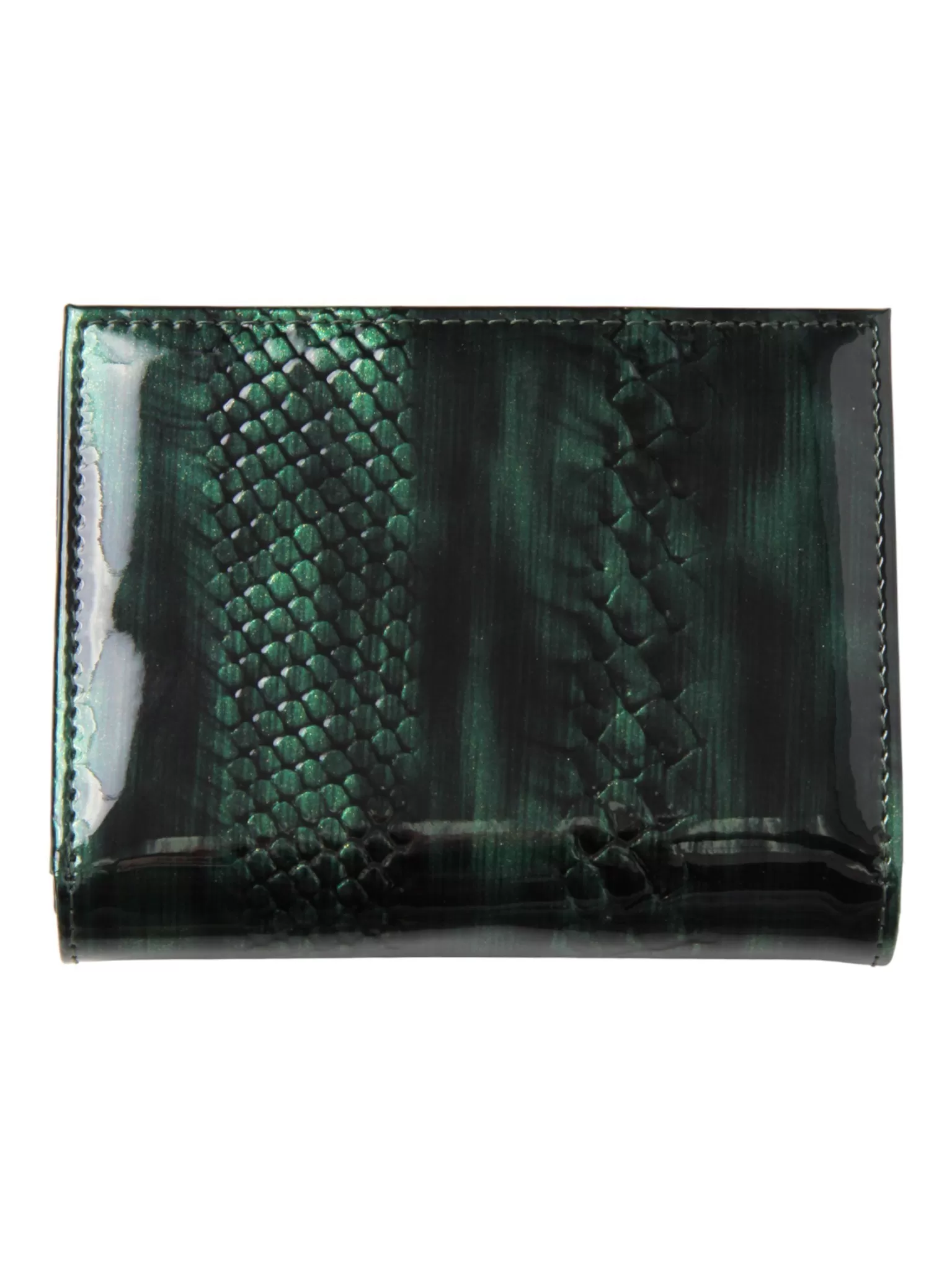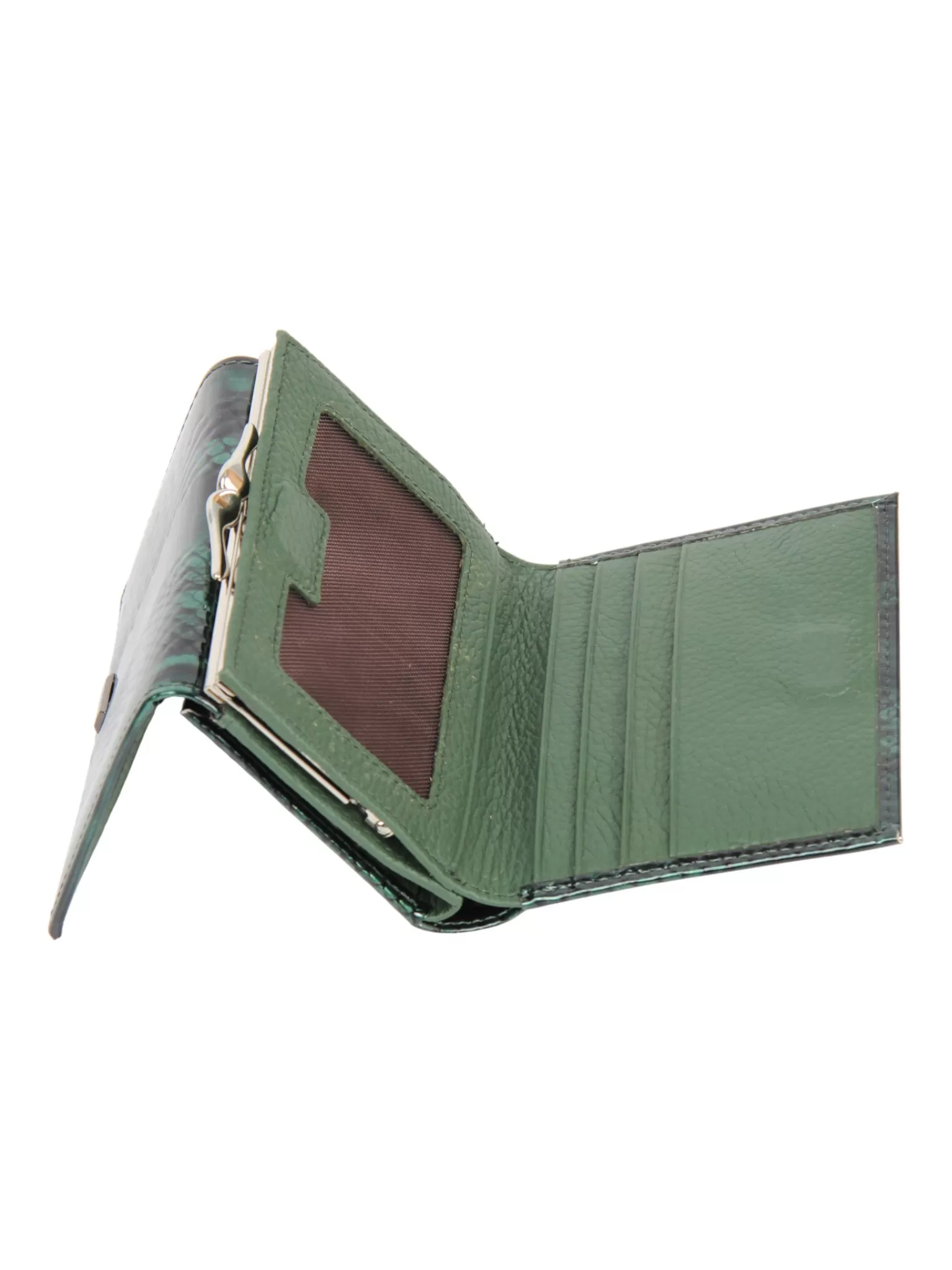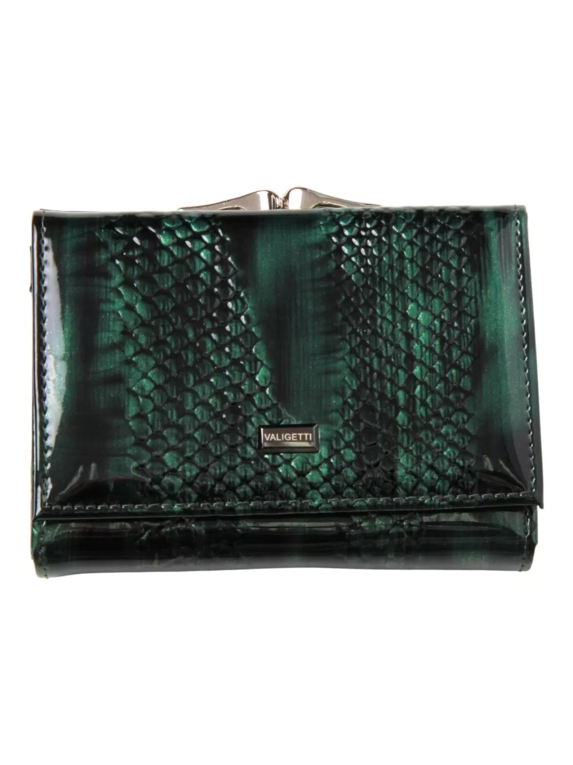 Кошелёк от бренда Valigetti изготовлен из натуральной кожи, зеленого цвета с узором в стиле змеиной кожи. У данной модели 2 отделения : одно небольшое и закрывается на замок-фермуар, а второе на клапан-магнит. Внутри у кошелька есть большое отделение для купюр, кармашек для документов, кармашек для мелочи и 6 специальных отделений для карточек.