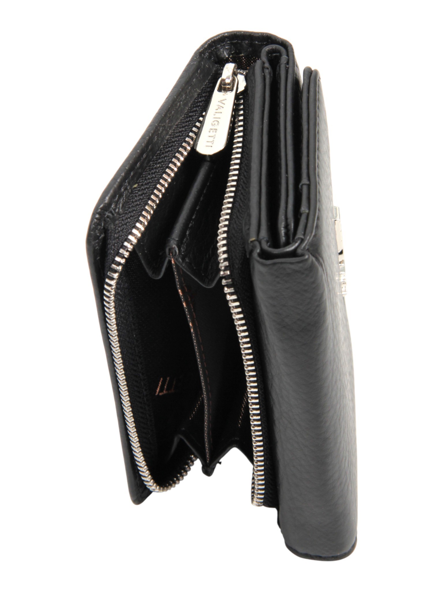 Кошелёк в черном цвете от бренда Valigetti изготовлен из натуральной кожи. У кошелька есть 2 отделения : первое закрывается на молнию-застежку и внутри разделено перегородкой, а второе отделение закрывается на клапан-магнит, внутри есть большое отделение для купюр, кармашек для мелочи, кармашек для документов и 6 специальных отделений под карты. Так же кошелек прошит фирменной подкладкой Valigetti.