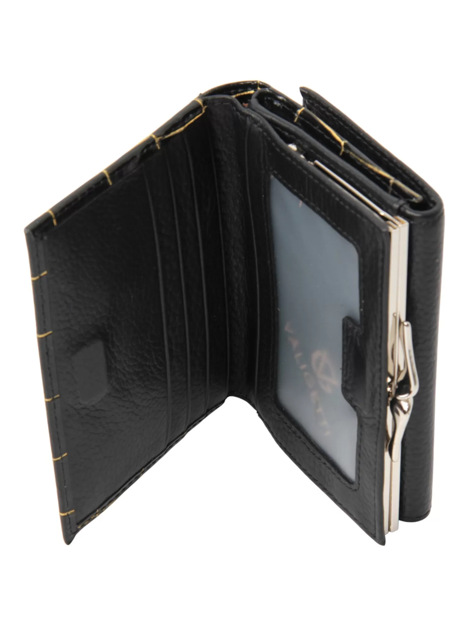 Кошелёк от бренда Valigetti изготовлен из натуральной кожи, черного цвета с узором в зернистом стиле. У данной модели 2 отделения : одно небольшое и закрывается на замок-фермуар, а второе на клапан-магнит. Внутри у кошелька есть большое отделение для купюр, кармашек для документов, кармашек для мелочи, 6 специальных отделений для карточек и кармашек для мелочи.