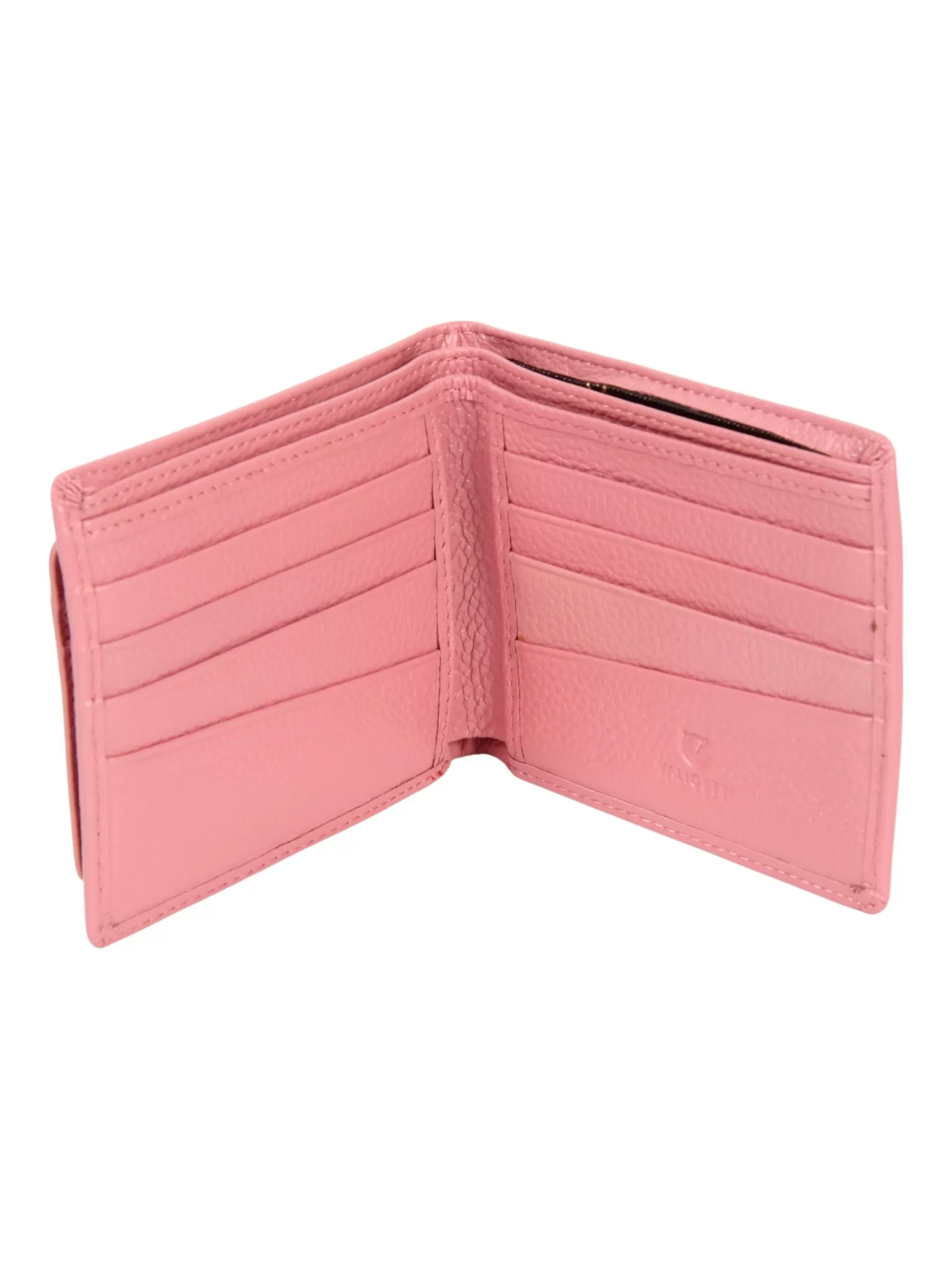Кошелёк в розовом цвете от бренда Valigetti изготовлен из натуральной кожи. У данной модели нет застежки, он открывается как книжка. У кошелька есть 2 отделения под купюры, 8 специальных отделений под карты и 2 кармашка под мелочь. Так же кошелек прошит фирменной подкладкой Valigetti.