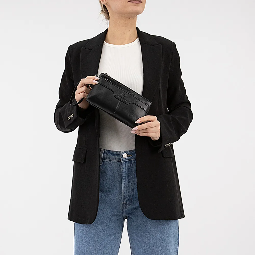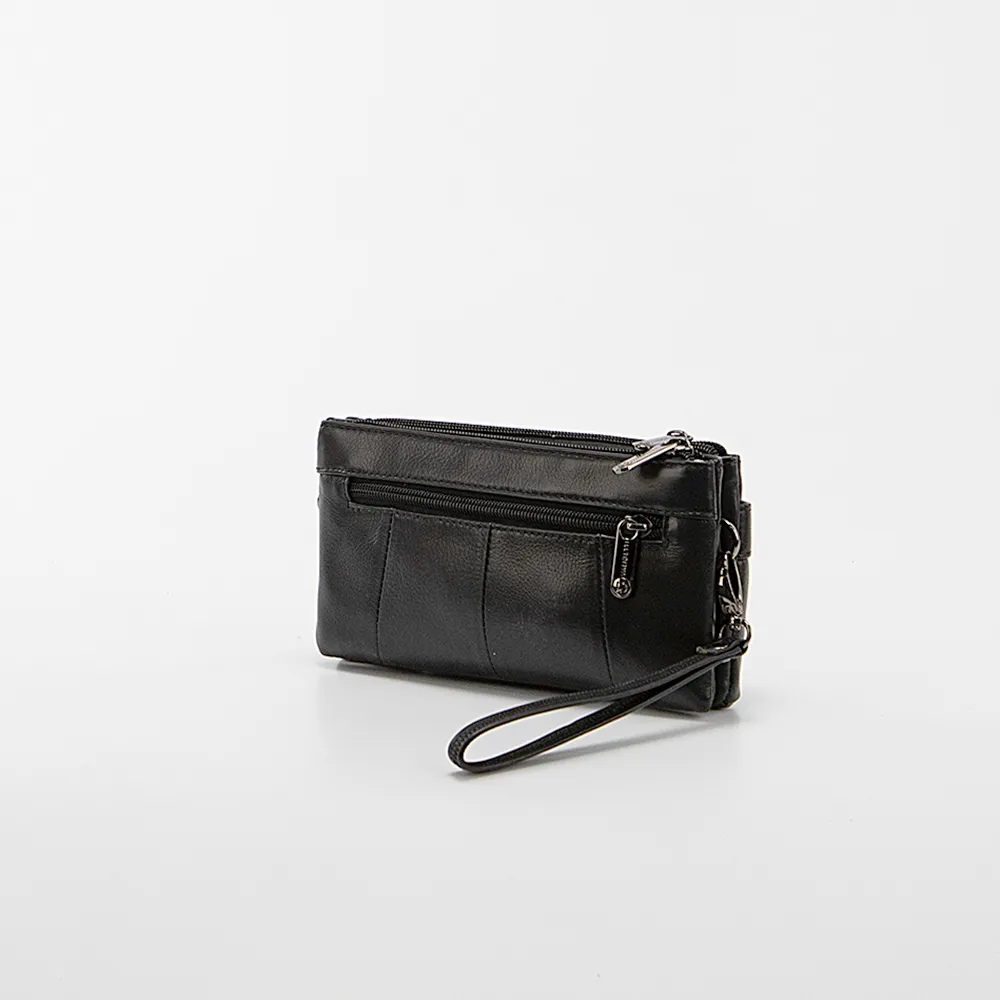 Клатч от торговой марки Valigetti из натуральной кожи цвета dark camel. Модель со съемным ремешком для запястья и съемным регулируемым плечевым ремнем. Три отделения с фирменной подкладкой. Крайние отделения закрываются молнией; в переднем – карманы для карт. Среднее отделение фиксируется магнитной кнопкой. На лицевой и задней сторонах – карман на молнии.