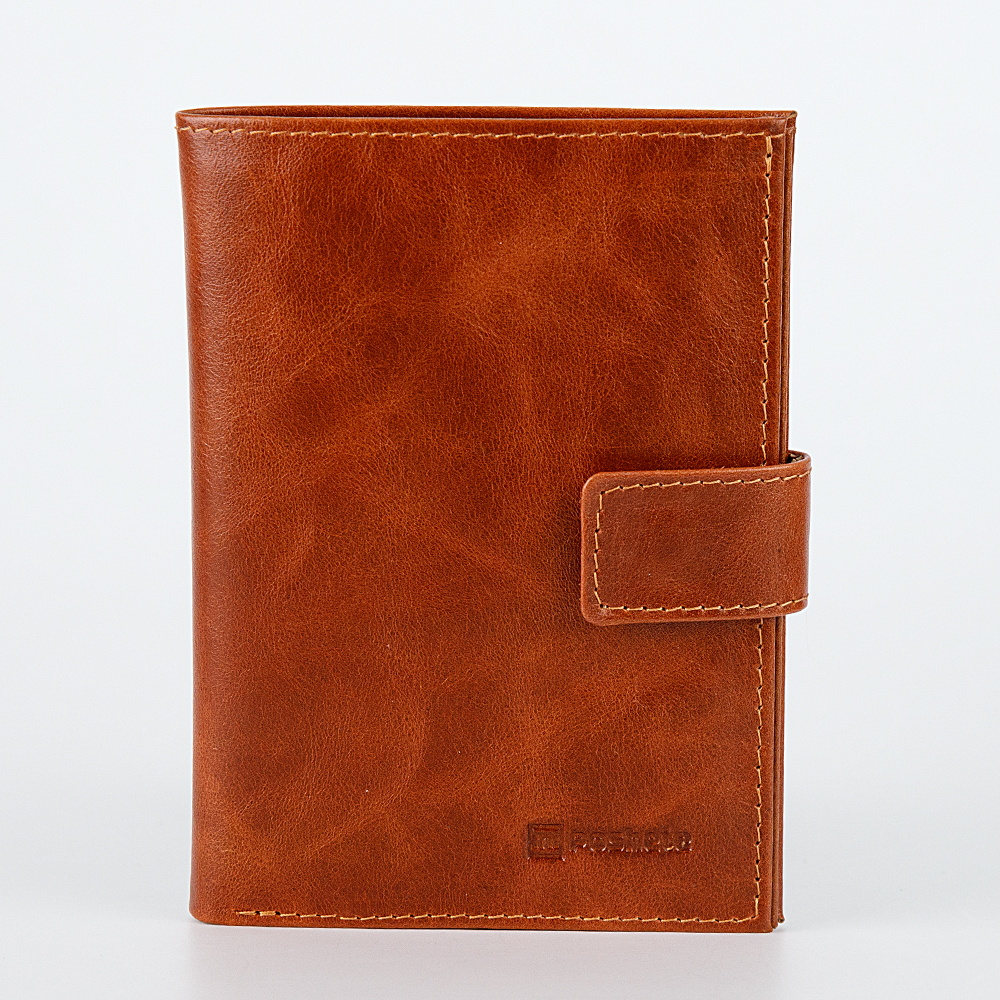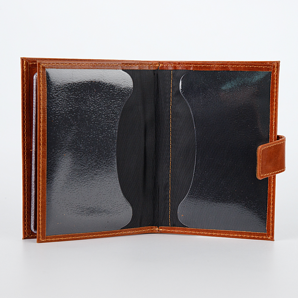 Бумажник от торговой марки Poshete изготовлен из натуральной зернистой кожи черного цвета. Модель для паспорта и автодокументов закрывается хлястиком на кнопку, раскрывается книжкой. Внутри: два отсека, разделенных перегородкой. В одном – съемный блок-вкладыш из прозрачных файлов для документов водителя разного формата, в другом – два клапана для паспорта. Имеется глубокое отделение для документов.