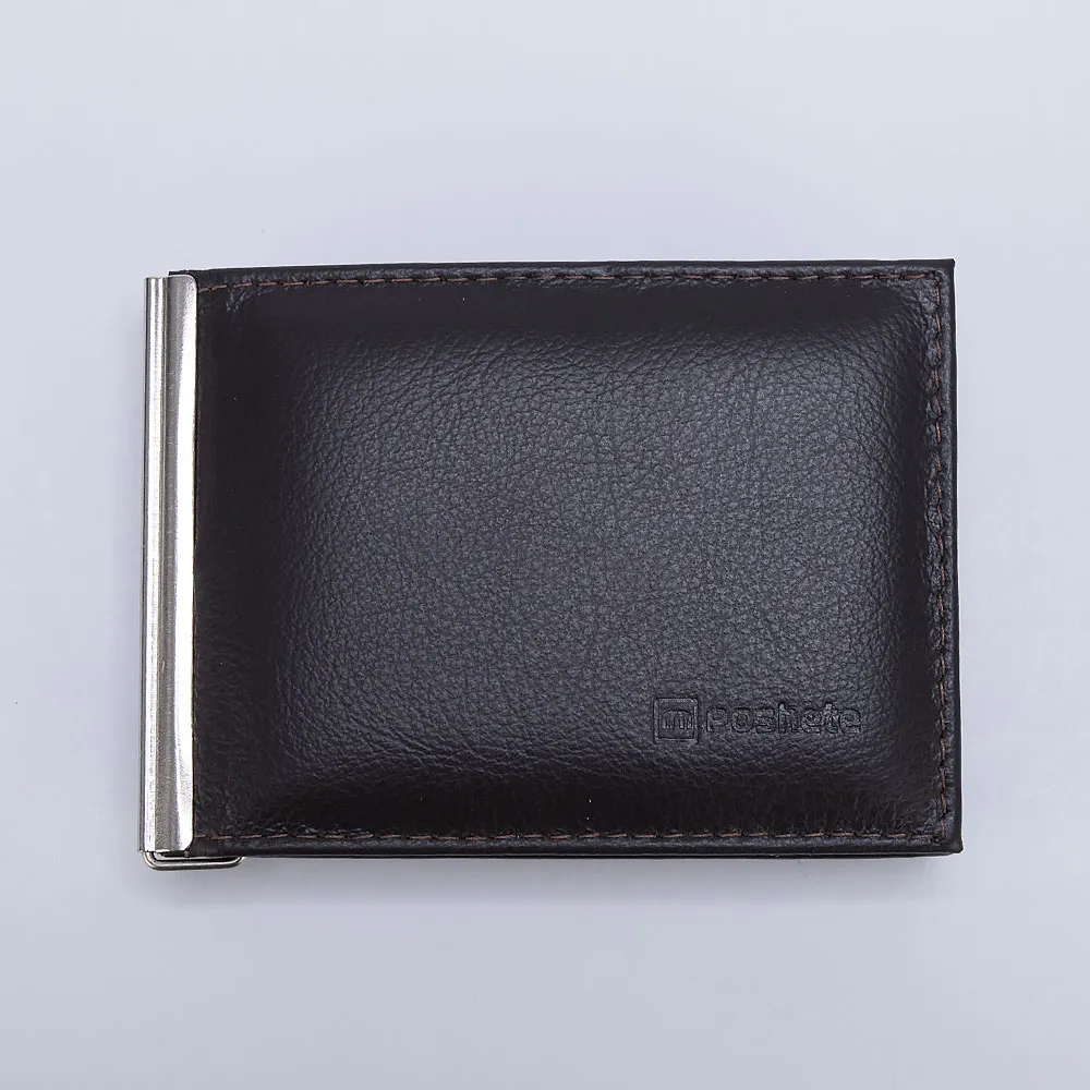 Зажим для денег от торговой марки Poshete из натуральной кожи коричневого цвета. Функциональная модель с двумя разворотами, которые фиксируются кнопкой. Один из разворотов с металлической скрепкой предназначен для купюр, второй разворот с шестью карманами для пластиковых карт и двумя внутренними карманами. Снаружи имеется карман для монет с клапаном на кнопке.